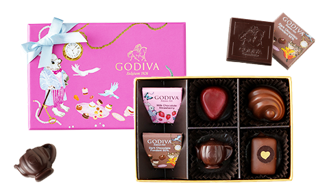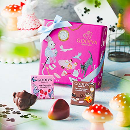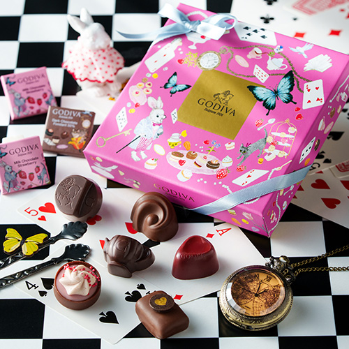 ティーパーティ。「不思議の国のアリス」のティーパーティーをイメージしたチョコレートを、トランプや白うさぎが描かれた大人かわいいイラストのパッケージに詰め合わせました。ゴディバ アリスのティーパーティ アソートメント 6個入2,592円