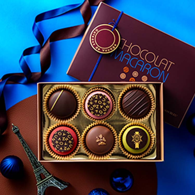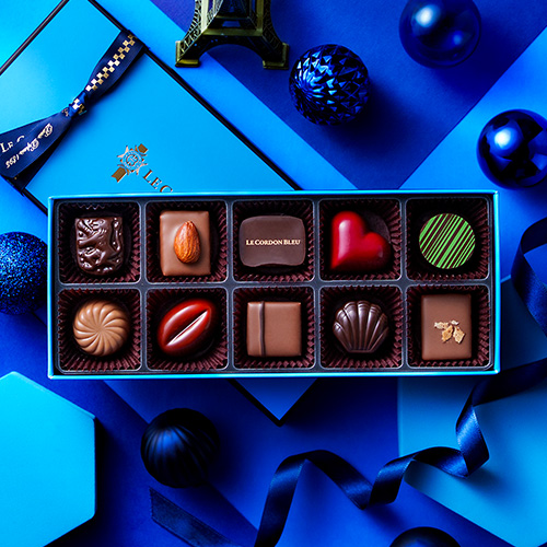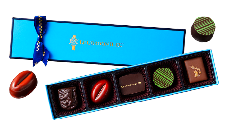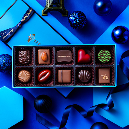 フランス美食文化。伝統と歴史あるフランス菓子・料理学校「ル・コルドン・ブルー」監修のボンボンショコラ5種の詰合せ。印象的な鮮やかなブルーのギフトボックス入り。ル・コルドン・ブルー ショコラ・デコール 5個入1,080円