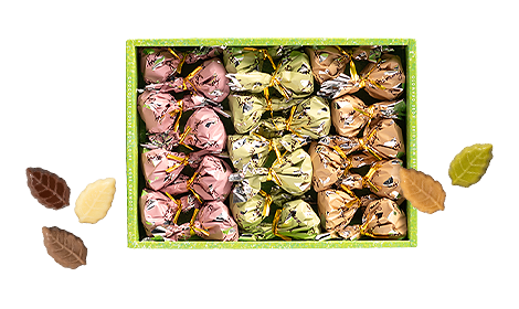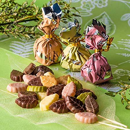 お配りチョコ。木の葉のカタチのチョコレートをカラフルな巾着で包んだ、その名も「リーフメモリー」。個包装になっているので、職場やお配り用にぴったりです。モンロワール リーフメモリーギフトボックス 24個入2,160円