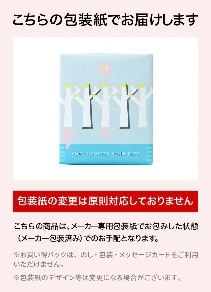 「シュガーバターの木」のツリー柄が描かれた北欧風のおしゃれな専用包装紙は、手土産や季節のご挨拶、内祝いに選ばれています。