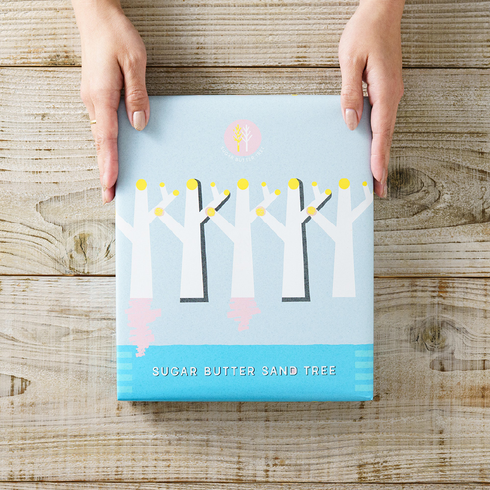 「シュガーバターの木」のツリー柄が描かれた北欧風のおしゃれな専用包装紙は、手土産や季節のご挨拶、内祝いに選ばれています。