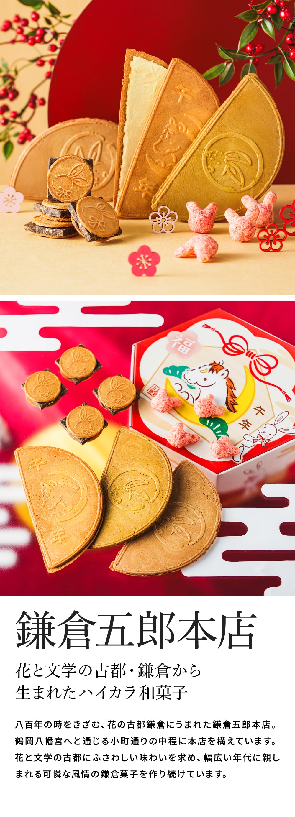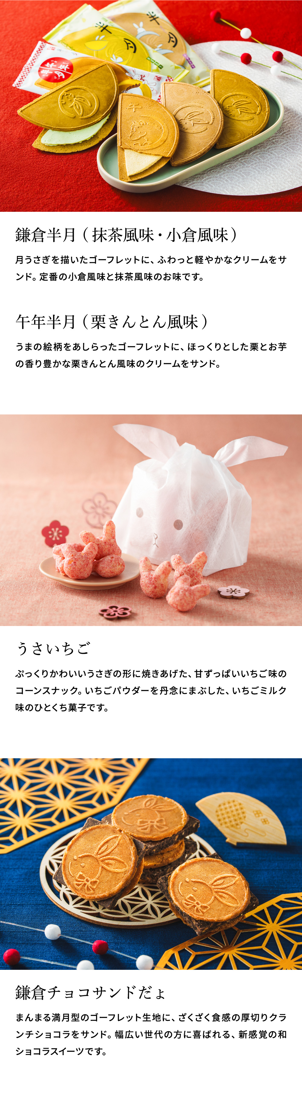 ●内容量:鎌倉半月/抹茶・小倉 各3枚、午年半月 3枚、鎌倉チョコサンドだょ 4個、うさいちご 1袋