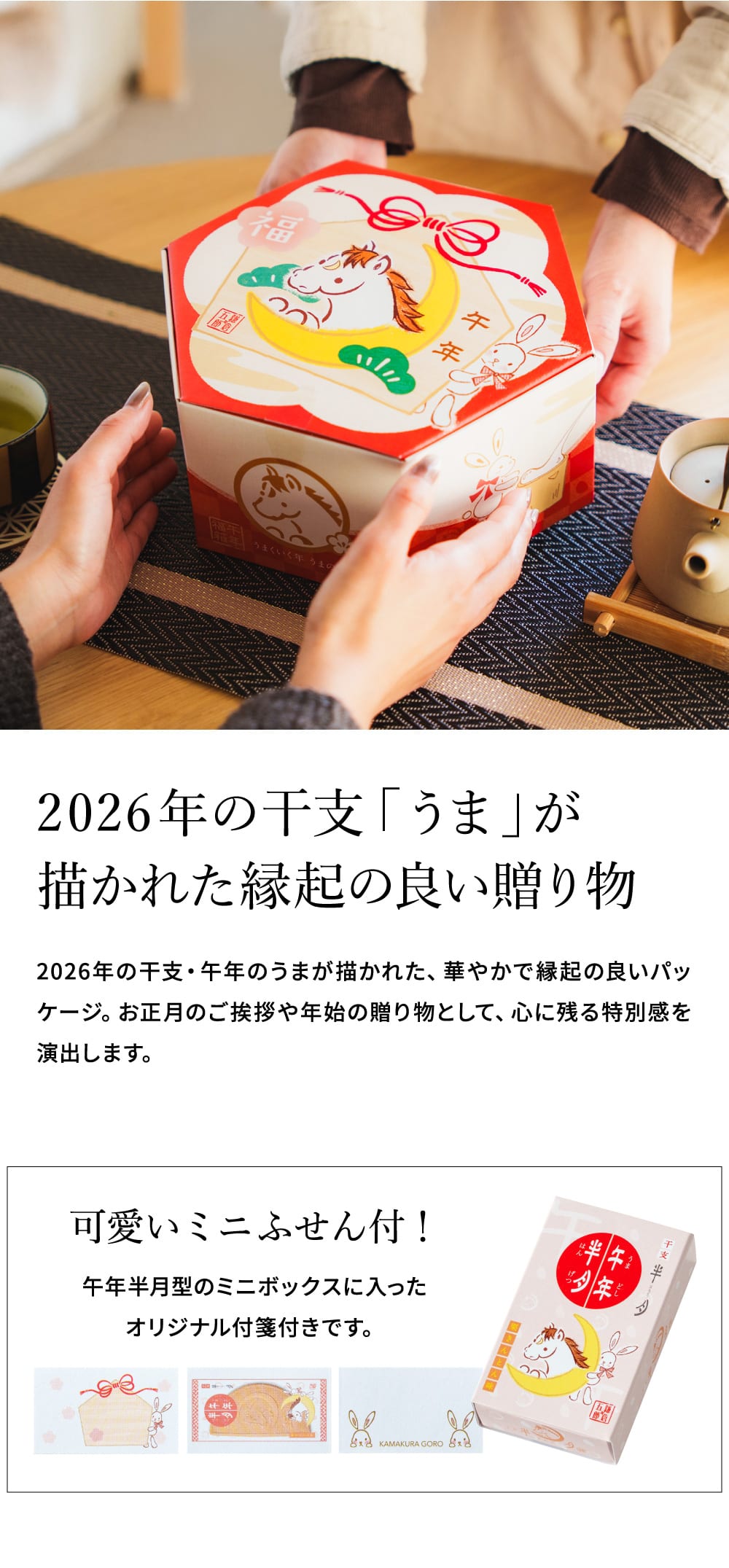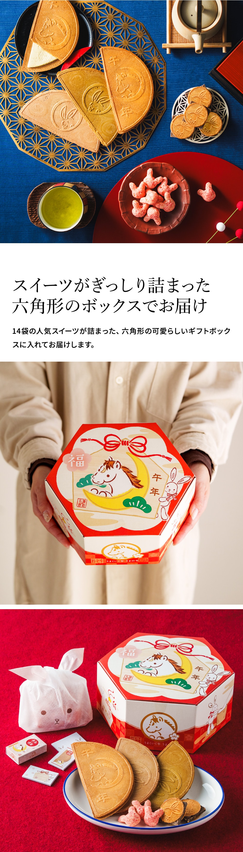 午年の動物「うま」の絵馬からひょっこり顔を覗かせるうさぎが愛くるしい、新年にふさわしいギフトボックスが登場!縁起がいいとされている六角形のボックスは、新年のお祝いの集まりや、お世話になった方へのご挨拶にもぴったり。