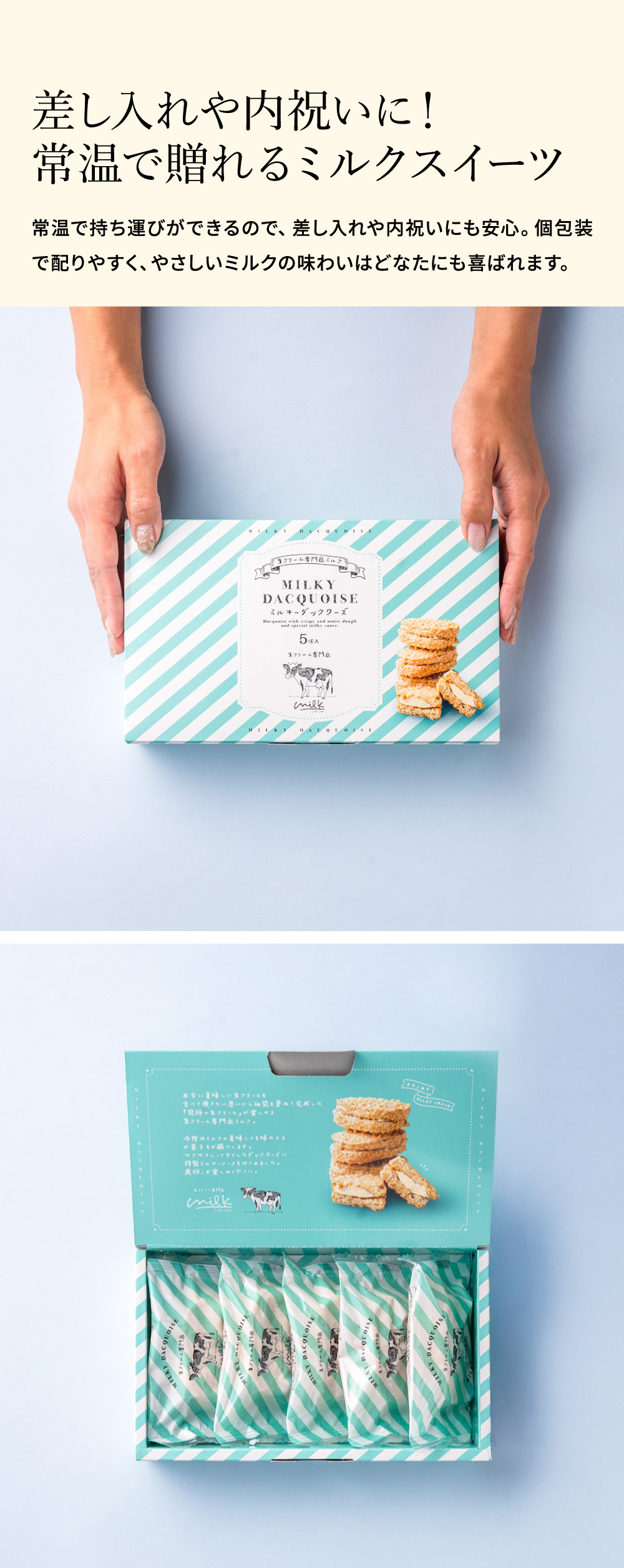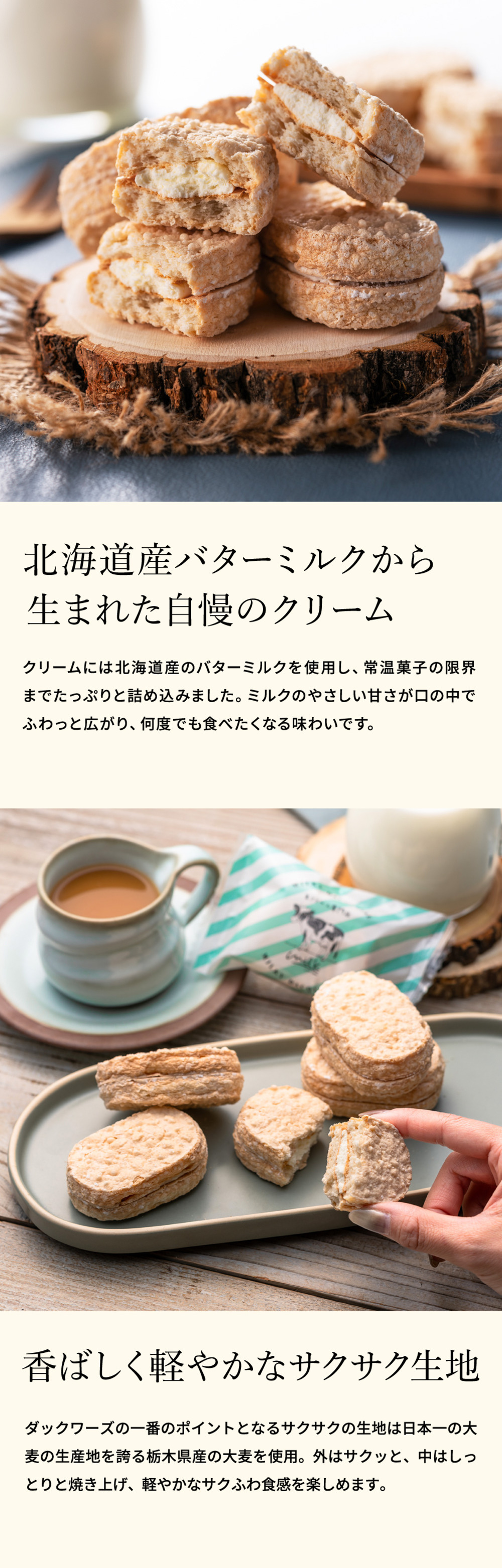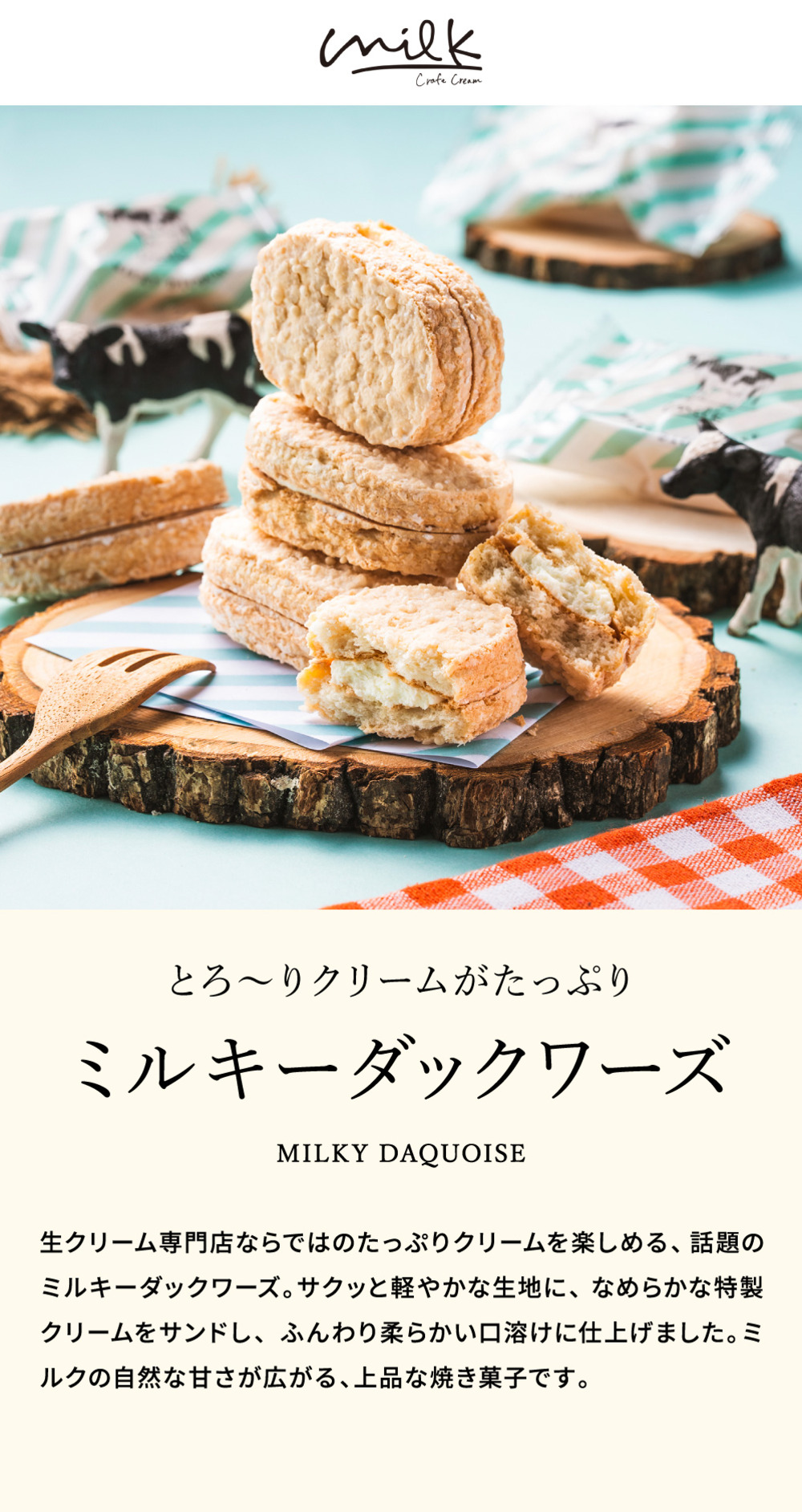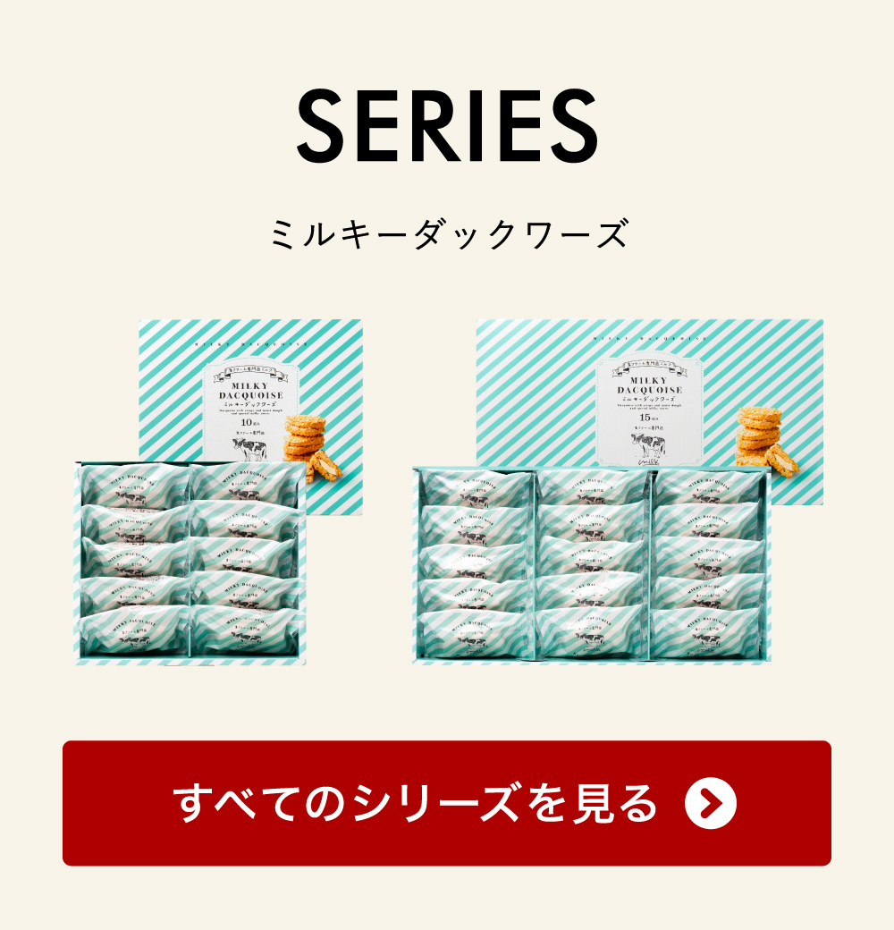 さっくり食感のダックワーズに、滑らかな特製ミルキークリームをはさんだ飽きのこない美味しさをお届けします。