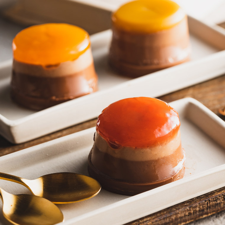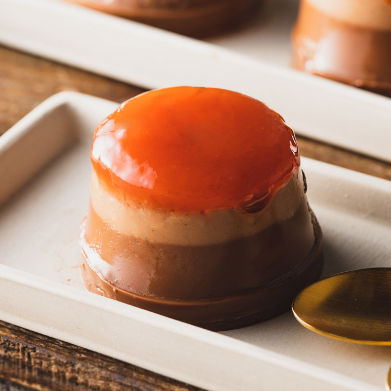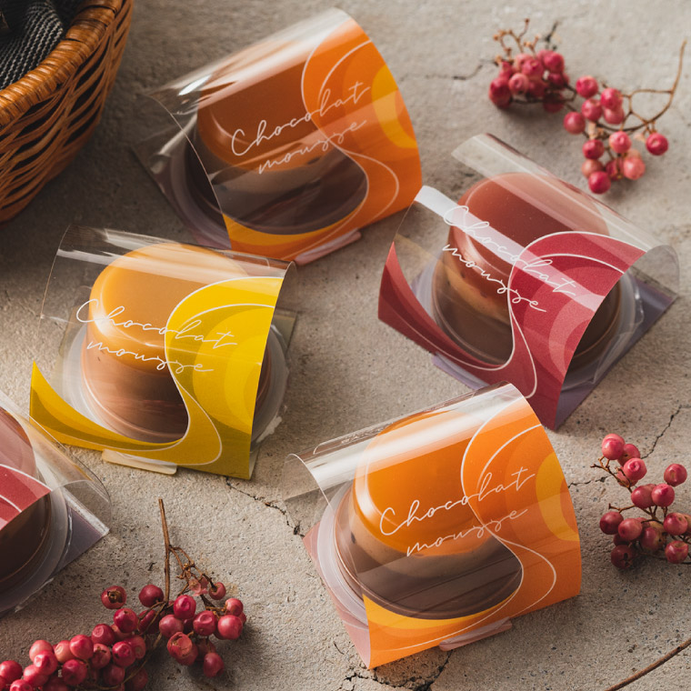 濃厚でとろけるショコラムースとコク深いジャンドゥーヤムースに、フルーツソースがアクセントになった、3層のショコラムースです。3層に分けることによって、3つの味が混ざって溶け合う至福の美味しさを実現しています。色が鮮やかで目を引くので、お茶会の手土産やギフトとしてぴったりなひと品です。