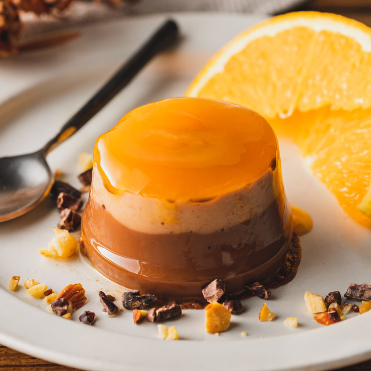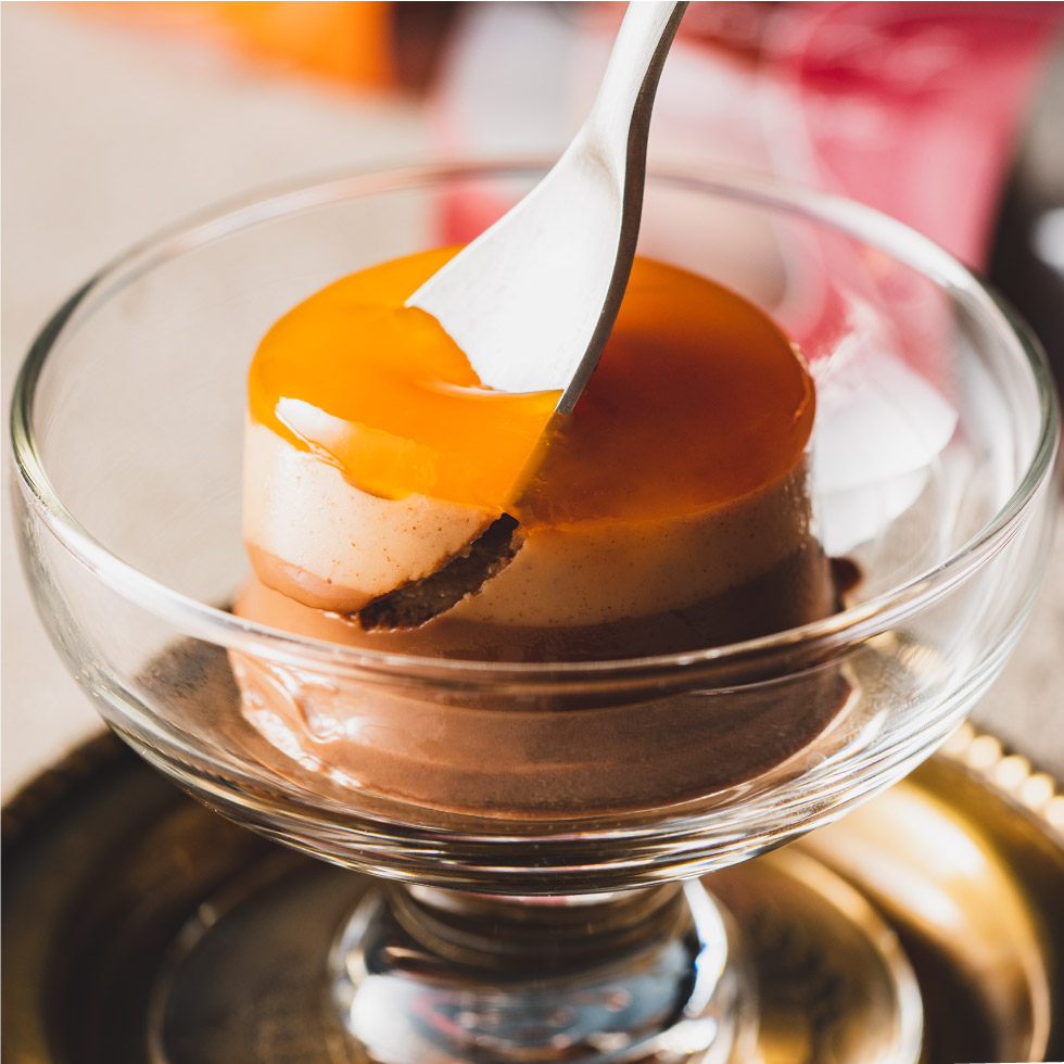 濃厚なショコラムースとジャンドゥーヤムースがオレンジソースと合わさって華やかな味わい。