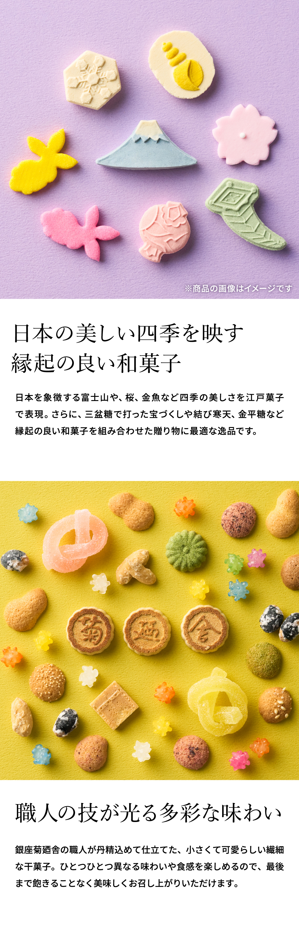 バターを使用しない和風クッキーに和三盆糖や金平糖等の干菓子が詰まった甘いお菓子です。創業百三十余年。五代目当主が描いたのは、富士の山を望む華やかな冨貴寄です。
