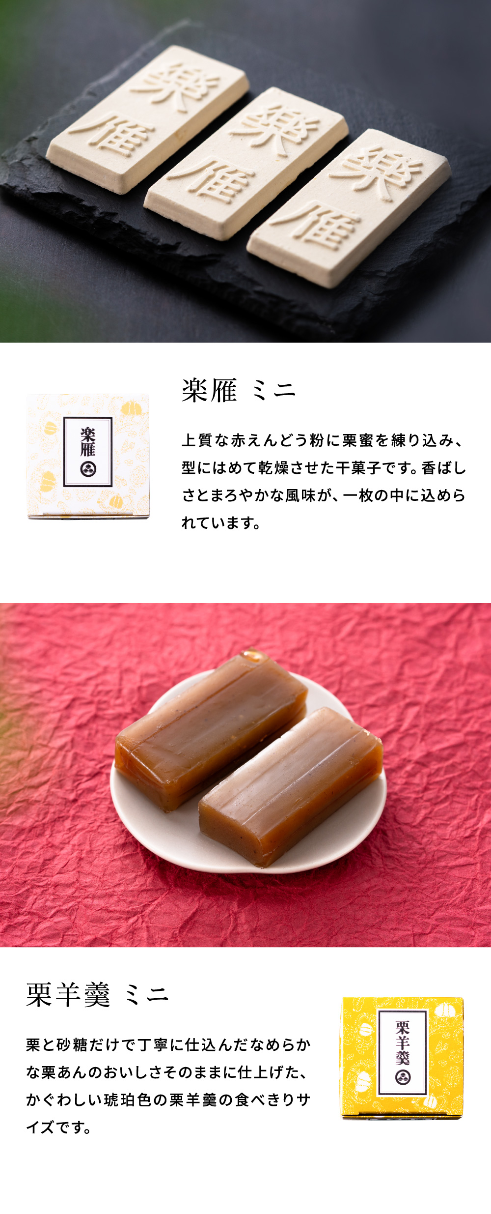 小布施堂の代表銘菓の栗鹿ノ子をはじめ、自家焙煎した赤えんどう粉と、きめ細かな粉糖をあわせて焼成した楽雁とおひとり様サイズの栗羊羹ミニ