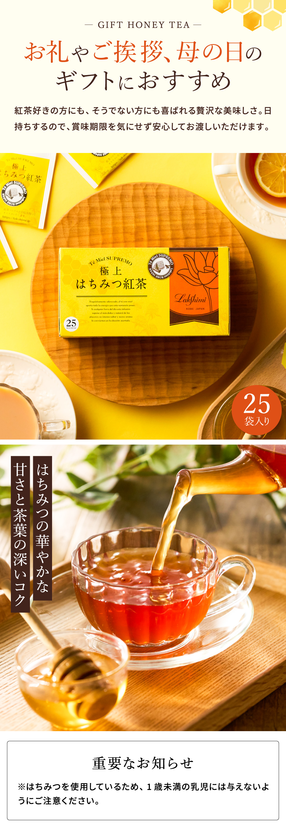 ●内容:25袋 ●箱サイズ:約15×7×8cm ●賞味期限まで240日以上の商品を発送 ●原材料:紅茶、はちみつパウダー(粉末はちみつ)/香料、甘味料(アスパルテーム(L-フェニルアラニン化合物を含む)) ※はちみつを使用しているため、1歳未満の乳児には与えないでください。