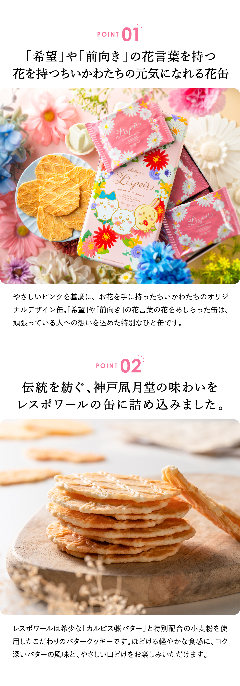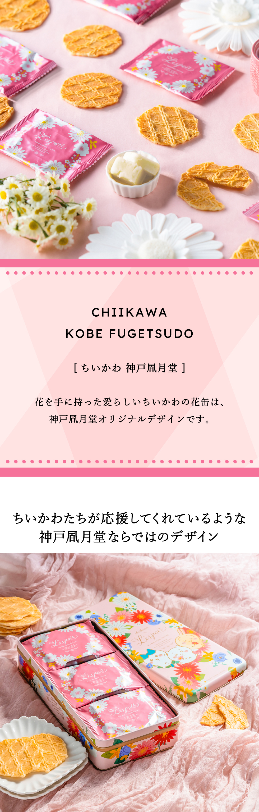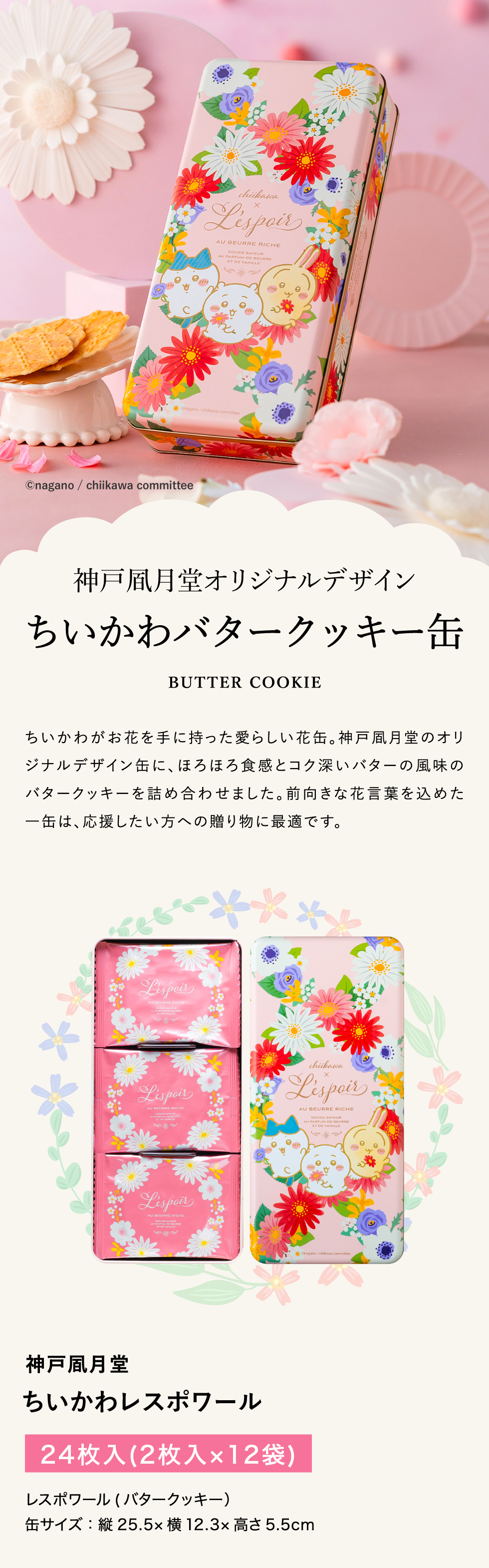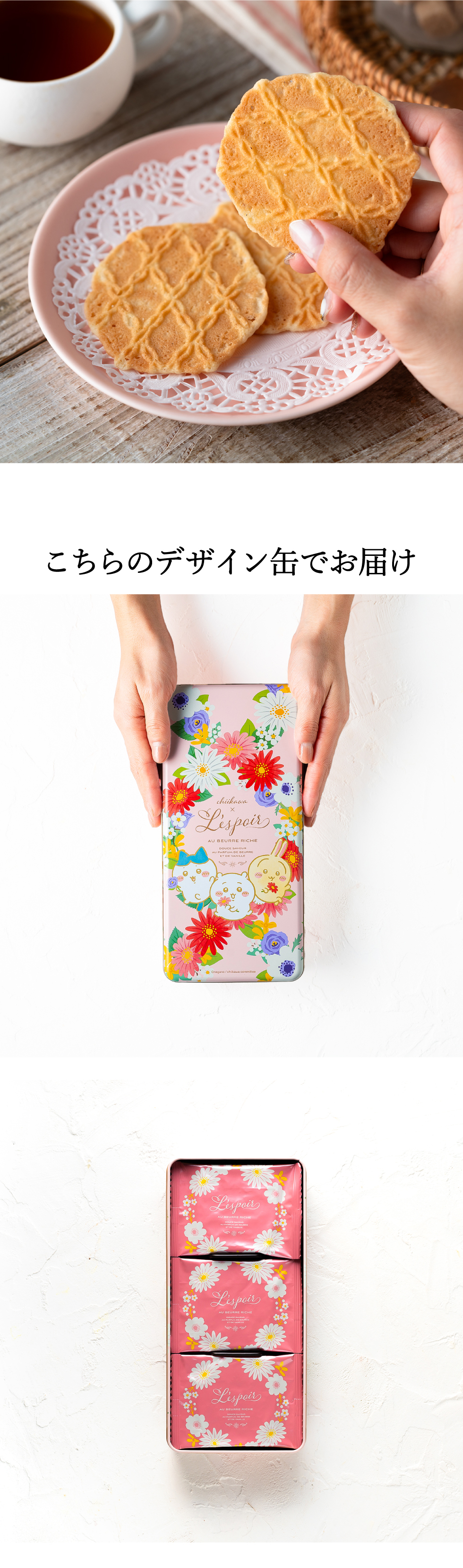 ちいかわデザインのレスポワールが登場しました。 「レスポワール」は、ほろほろと口の中でほどける軽やかな食感が特徴。 コク深いバターの風味と、やさしい口どけをお楽しみいただけるクッキーです。 やさしいピンクを基調にした花缶には、お花を手にした ちいかわ、ハチワレ、うさぎがかわいらしく描かれています。 見ているだけで笑顔になれる、愛らしいデザインです。 缶には「希望」や「前向き」などの花言葉を持つ花々を、花束のように組み合わせたデザインを採用。 花言葉に込められたやさしい想いと、キャラクターたちのあたたかな魅力がひとつになった特別なひと缶です。 (C)nagano / chiikawa committee