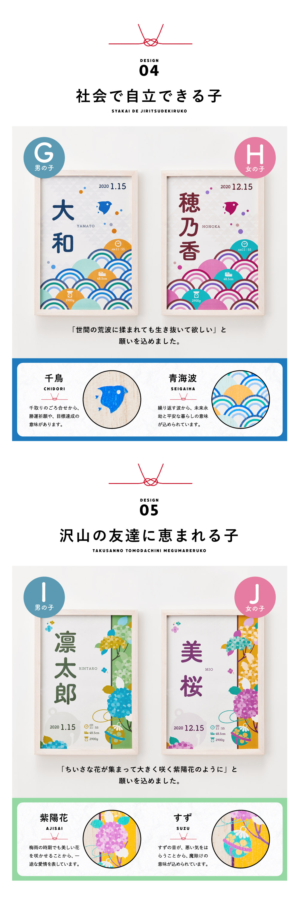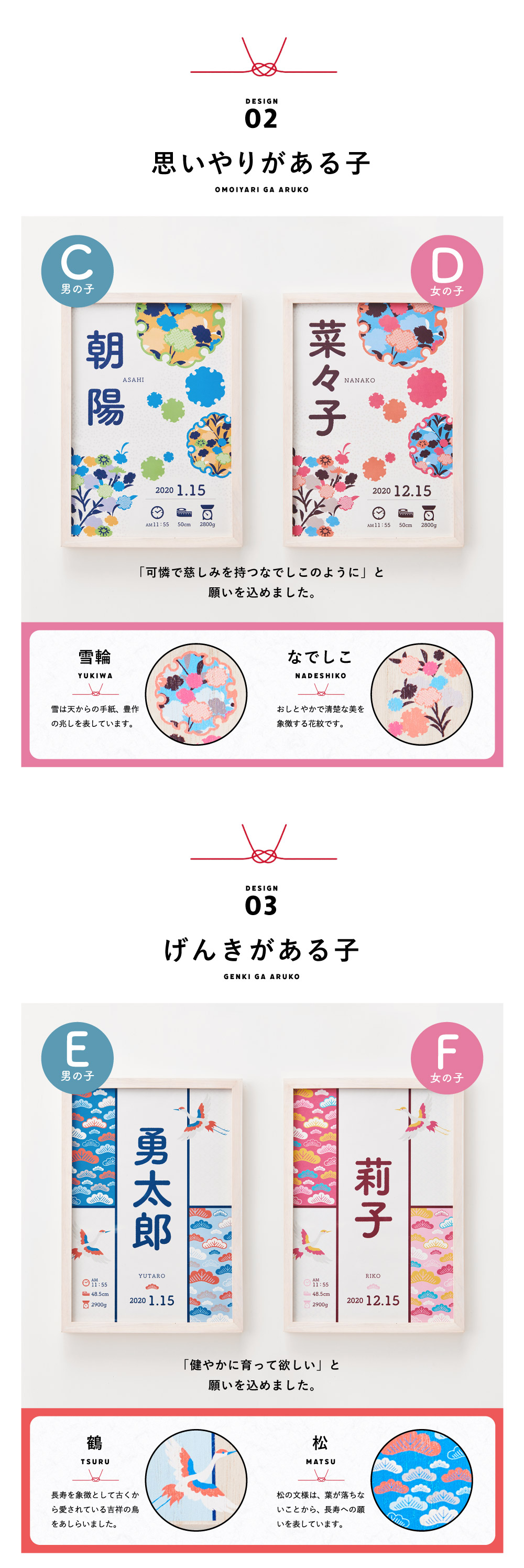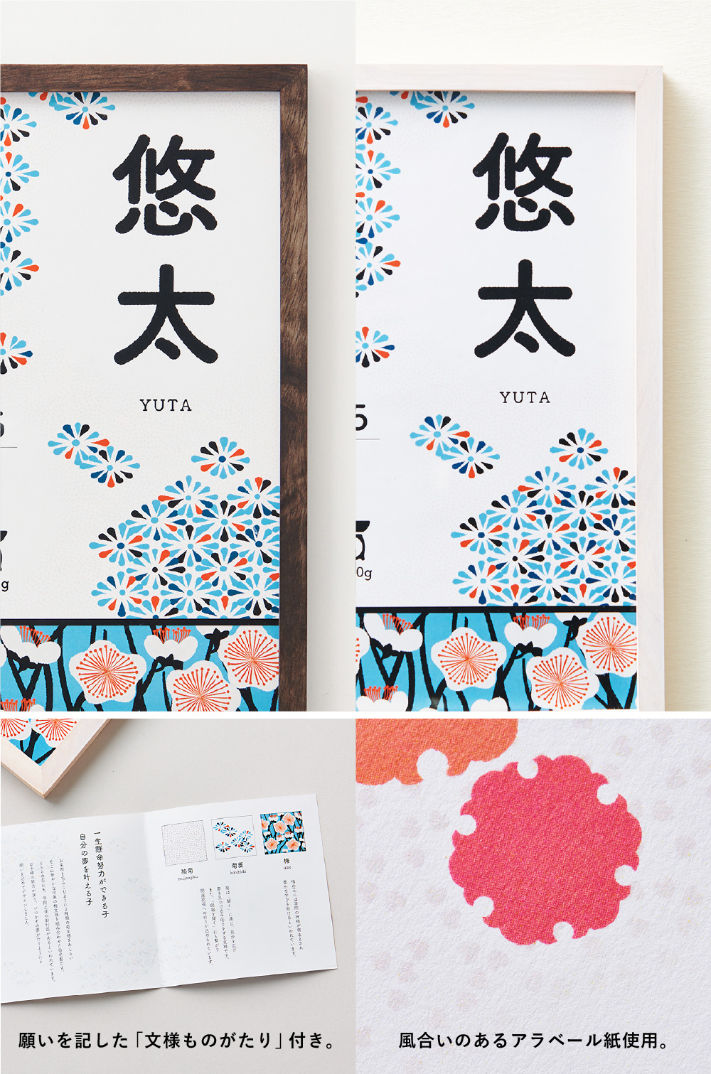 お子さまの性別やお好みに合わせて選べる2種類のフレームをご用意しました。独特の風合いで優しい手触りが特徴的な高級紙アラベールを使用しています。吉祥文様の由来や、お子さまへの将来の願いが書かれたカード付きです。