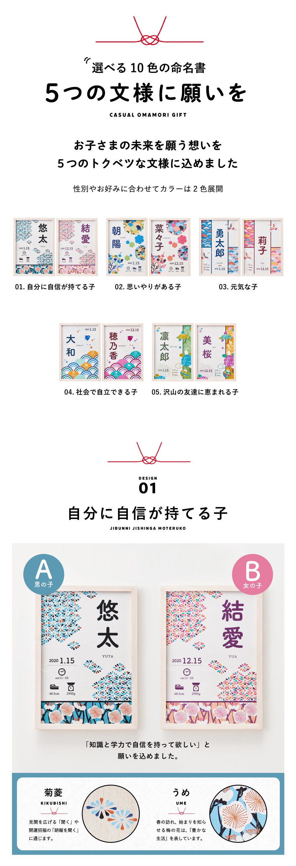 想いや願いが込められた縁起のいい10種類の吉祥文様に、お子さまの名前や誕生日などが入れられる「命名書」。壁にかけたり、棚に置いたり生活スペースに合わせて自由に飾ることができます。名前は両親からのはじめての、そして一生の贈り物。願いを込めた文様の由来が書かれたカードをつけてお届けします。