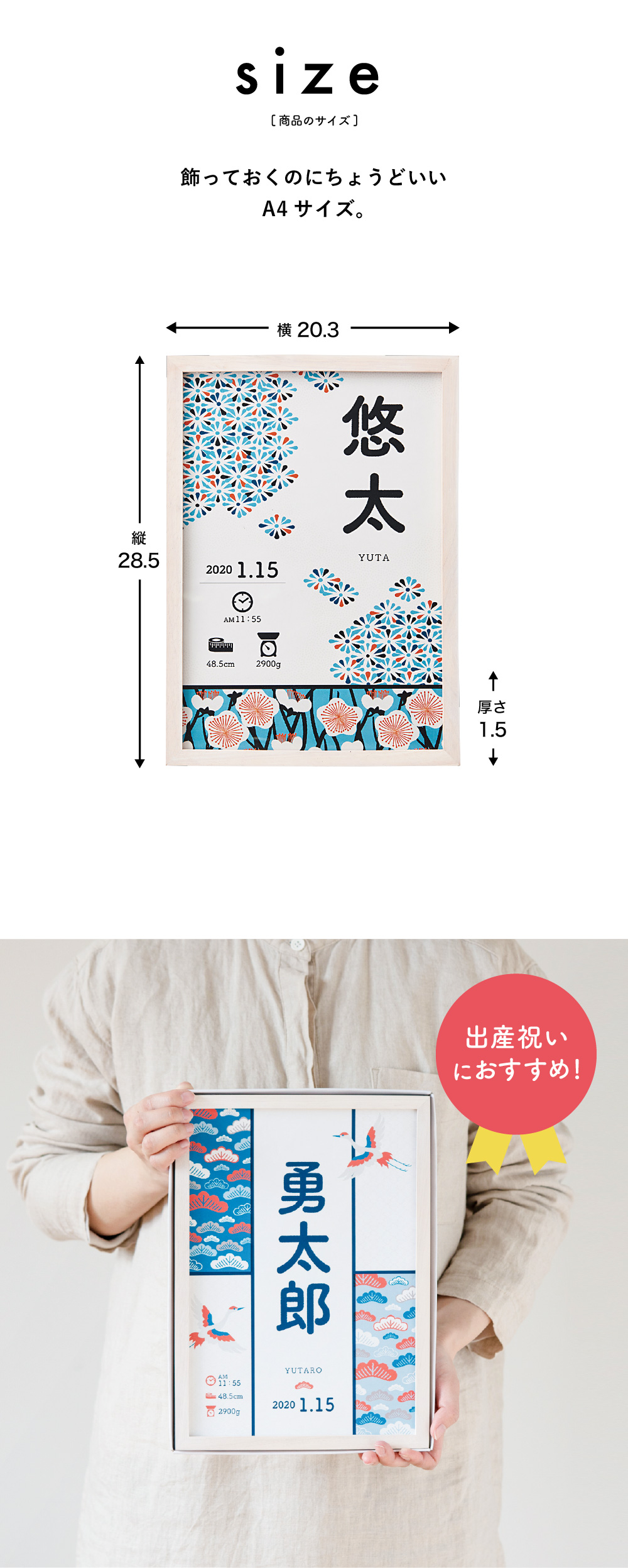 お子さまのお名前や誕生日だけではなく、身長や体重、生まれた時間も入れることができます。世界で一番とくべつな名前と世界一の愛情を込めたとくべつな一枚の完成です。