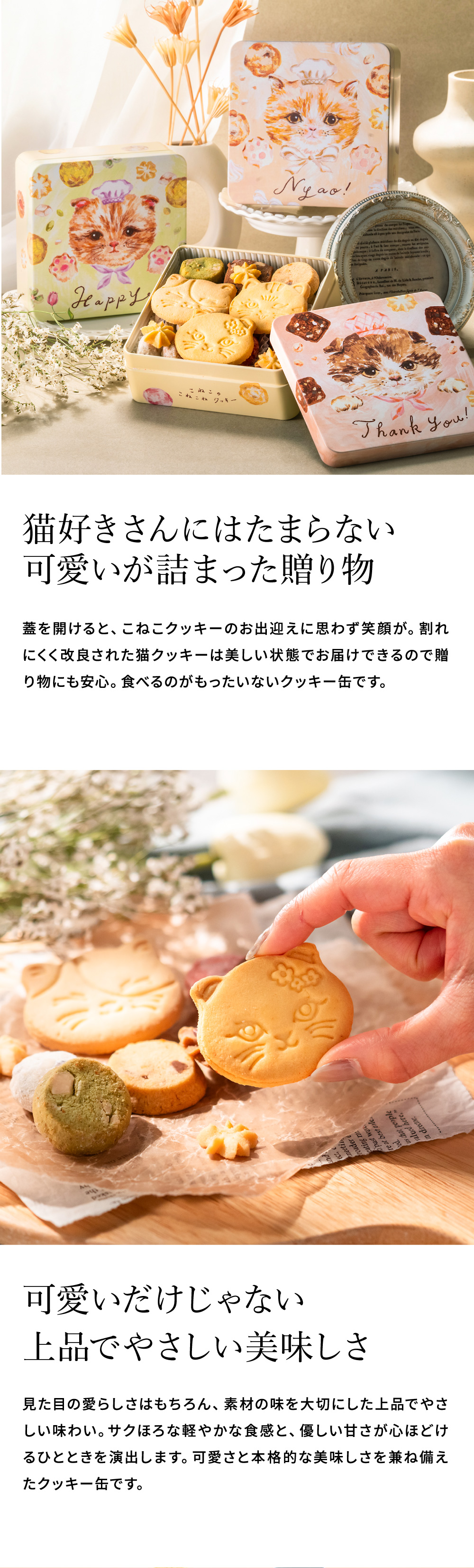 ●内容量:クッキー×27(バター×3、バニラ×3、ミルク&マカダミアナッツ×3、ダーク&ヘーゼルナッツ×3、ホワイト&ピスタチオ×3、アーモンド&コーヒー×4、スノーホワイト×4、スノーストロベリー×4)※クッキーのこねこの顏はランダムとなります。 ●賞味期限まで33日以上の商品を発送 ●箱サイズ:(約)12×12×5cm ●アレルゲン(特定原材料等28品目):卵、乳成分、小麦、アーモンド、大豆、マカダミアナッツ