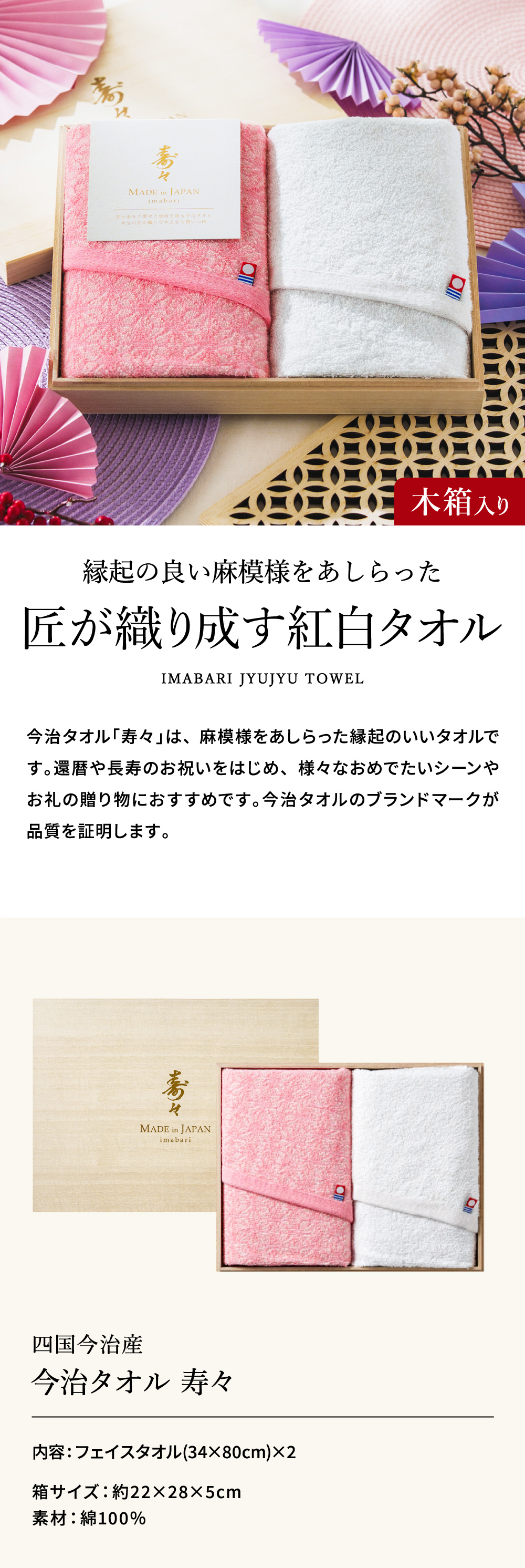 今治タオル 寿々(じゅじゅ)木箱入り紅白タオルセット(フェイスタオル2P)