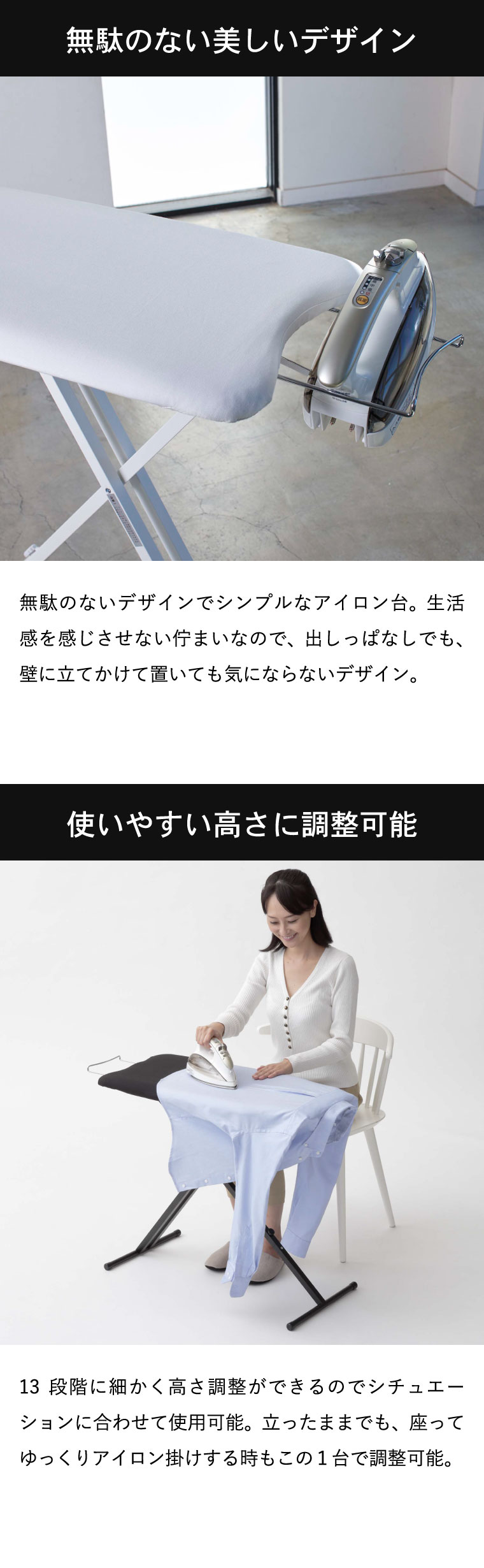 【素材・材質】表面布:綿100% クッション材:ポリエステル 天板・脚部:スチール(粉体塗装) ボタンプレスゾーン(凹凸吸収クッション):ポリウレタンフォーム アイロン置き台:スチール(クロームメッキ) キャップ:ポリエチレン