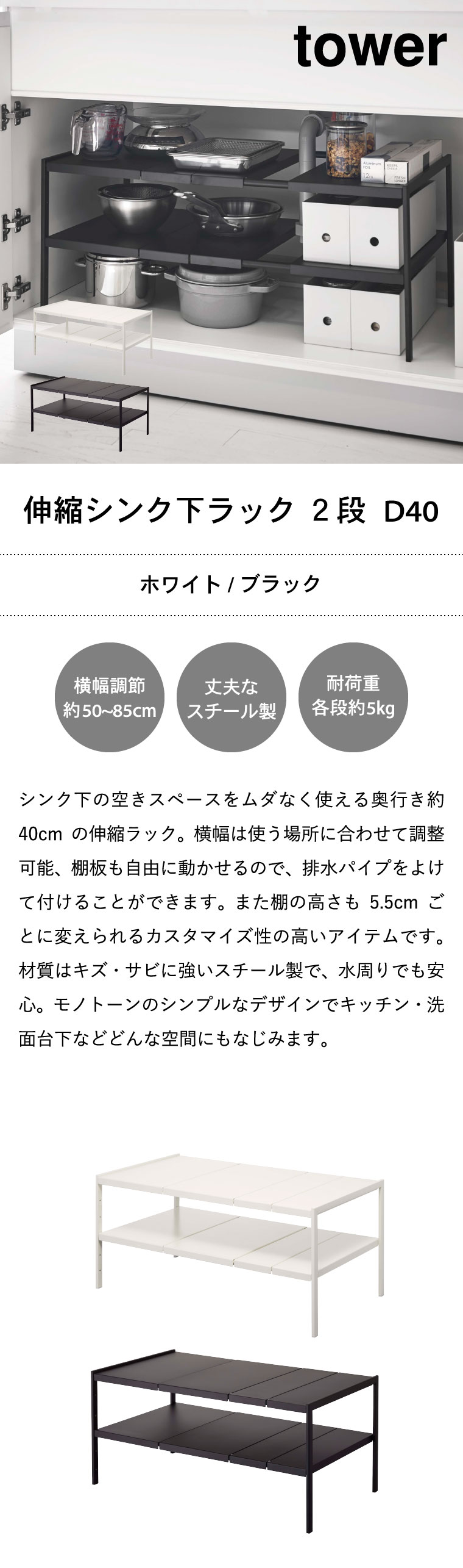 伸縮シンク下ラック 2段 tower タワー D40