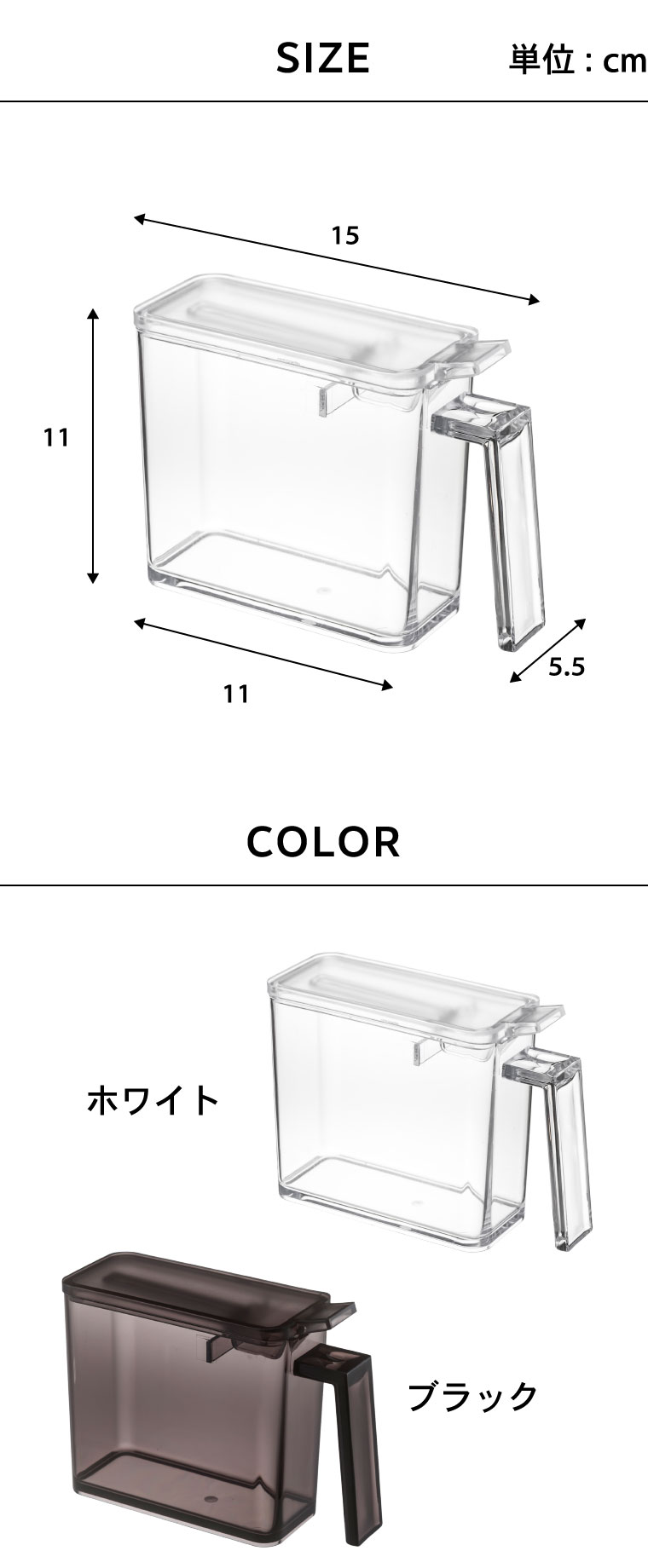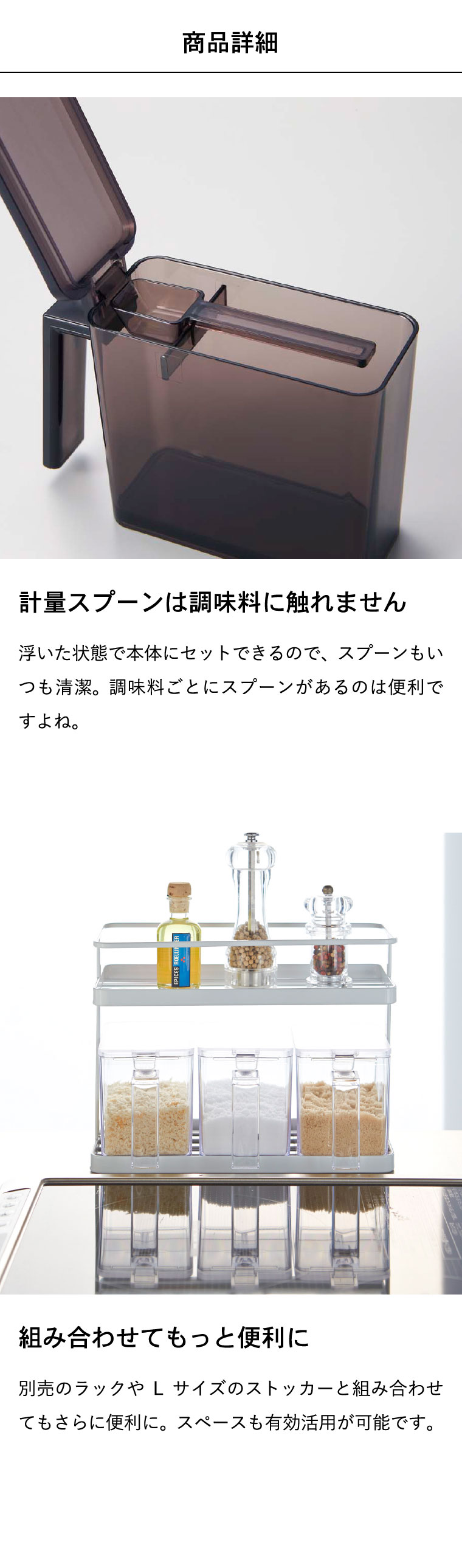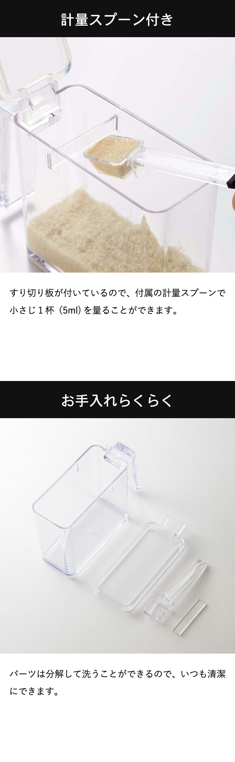 ●素材・材質:容器・スプーン・すり切り板・蓋:PS樹脂 ●商品サイズ:(約)横5.5×奥行き15×高さ11cm ●商品重量:(約)155g ●型番:KT-TW CP S WH/KT-TW CP S BK ●JANコード:4903208028677 4903208028684