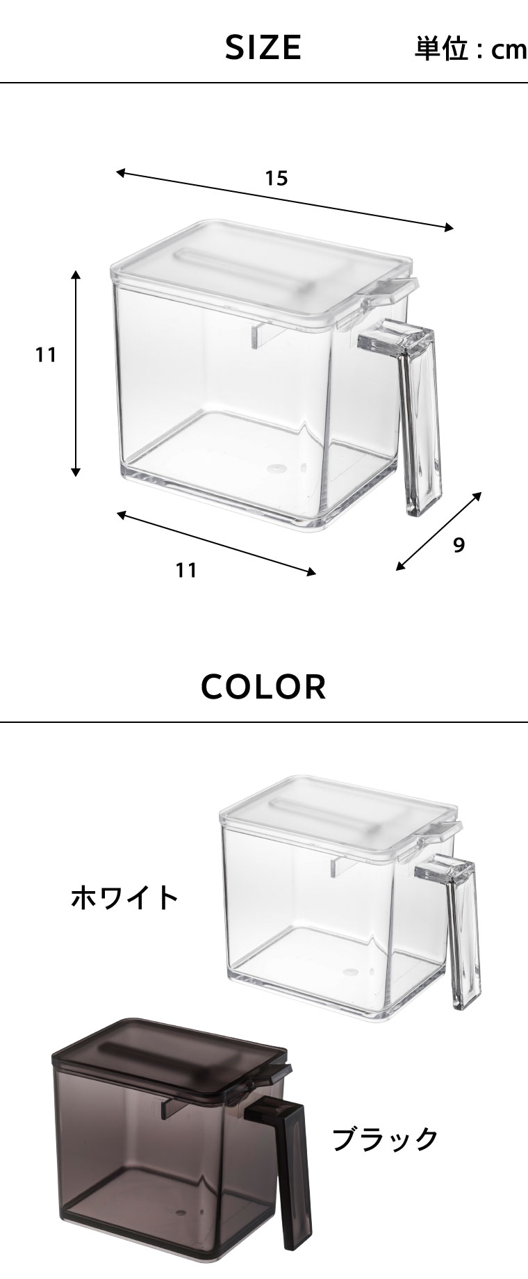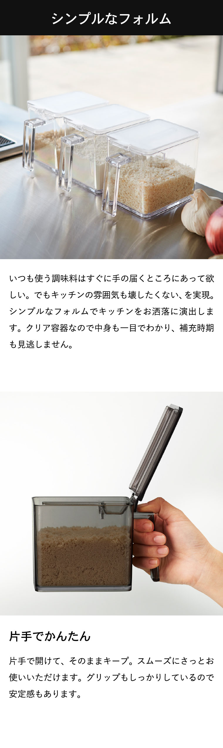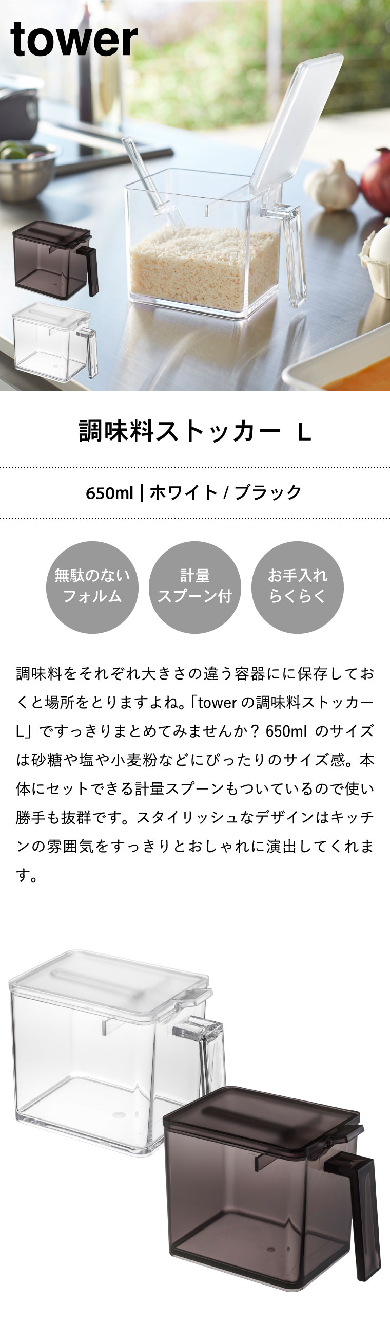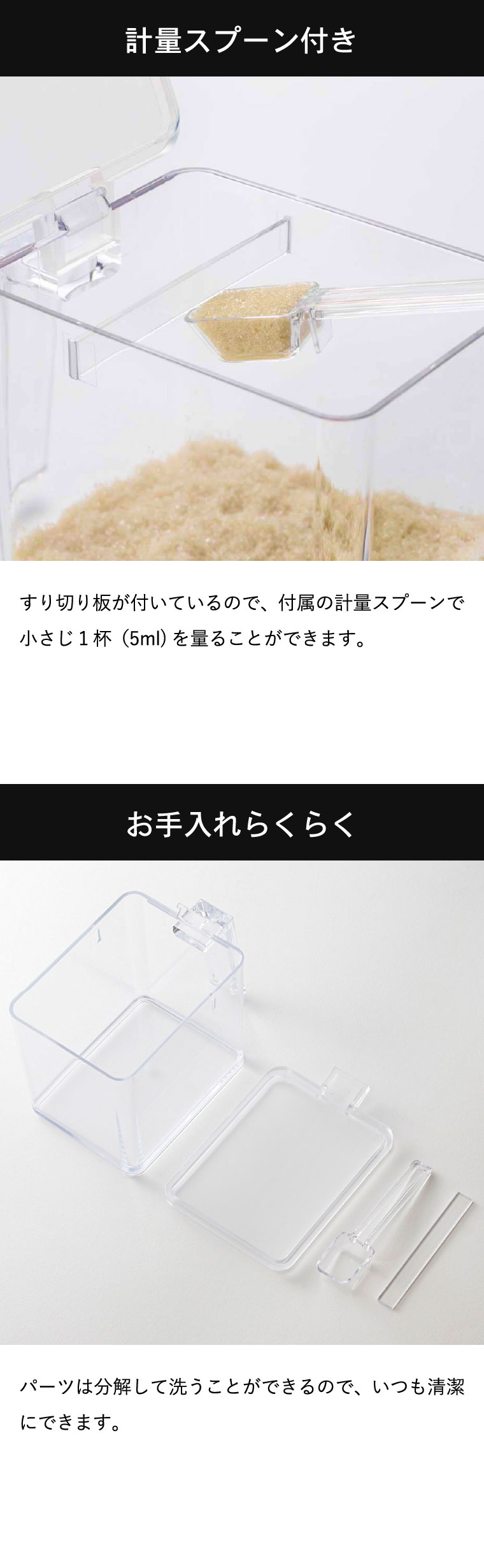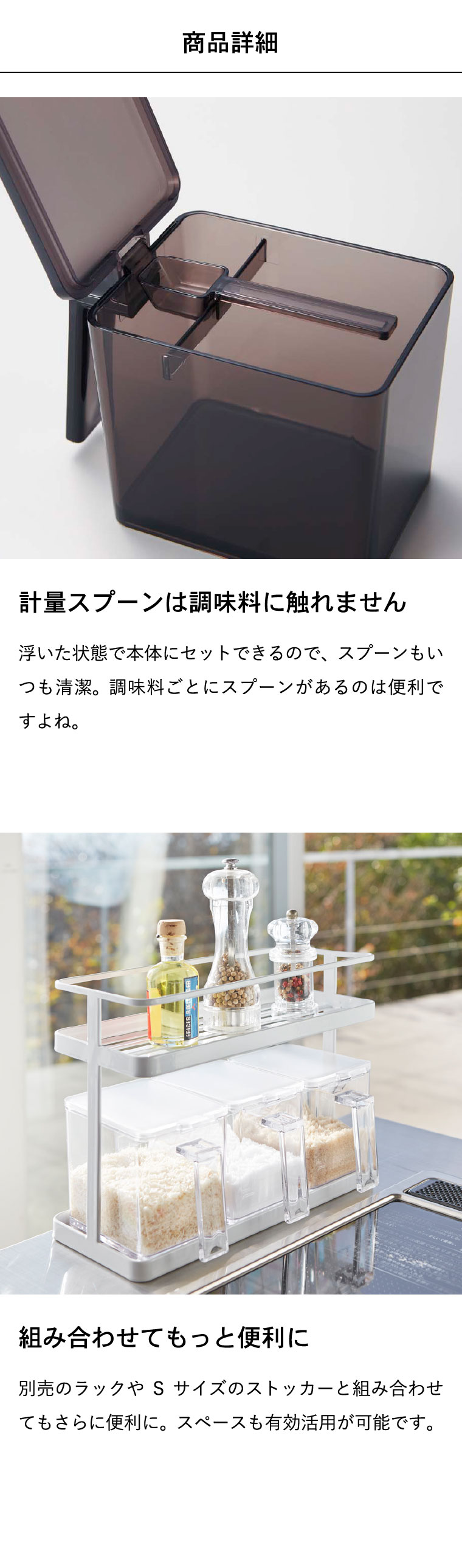 ●素材・材質:容器・スプーン・すり切り板・蓋:PS樹脂 ●商品サイズ:(約)横9×奥行き15×高さ11cm ●商品重量:(約)220g ●型番:KT-TW CP L WH/KT-TW CP L BK ●JANコード:4903208028691 4903208028707