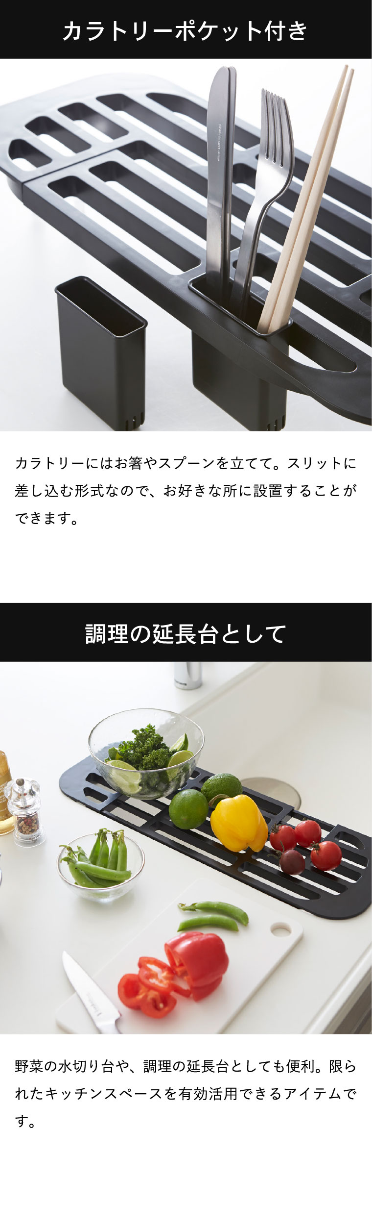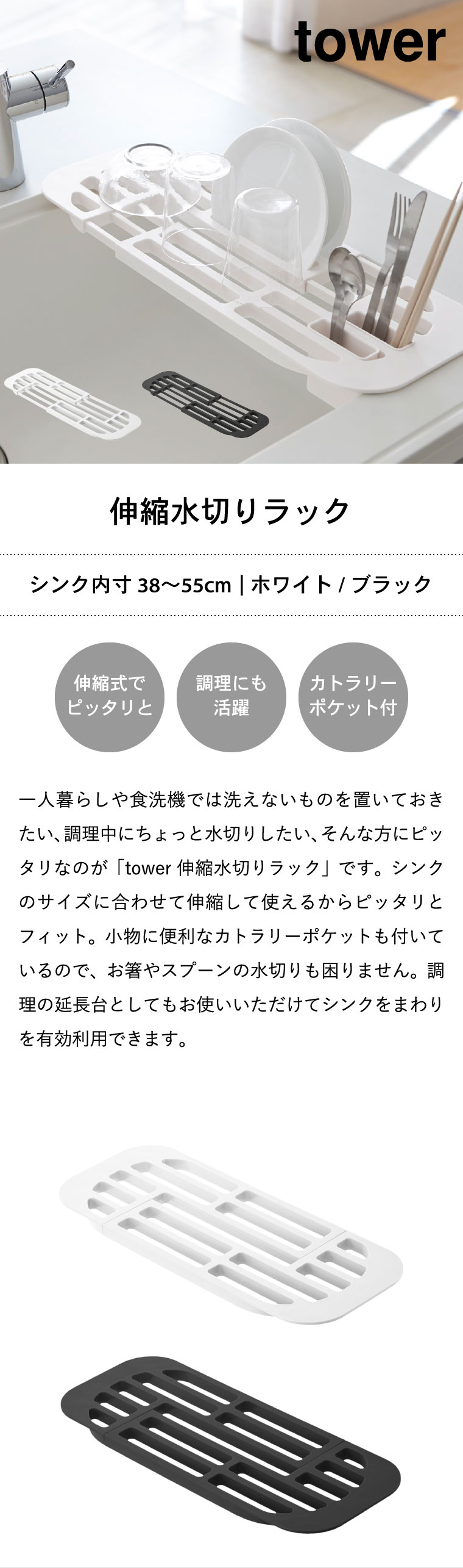 ●対応サイズ:シンク内寸:約38~55cmまで ●素材・材質:本体:ABS樹脂 ●商品サイズ:(約)横44~61×奥行き17.5×高さ1.6cm ●商品重量:(約)475g ●型番:KT-TW CR WH/KT-TW CR BK ●JANコード:4903208028738 4903208028745