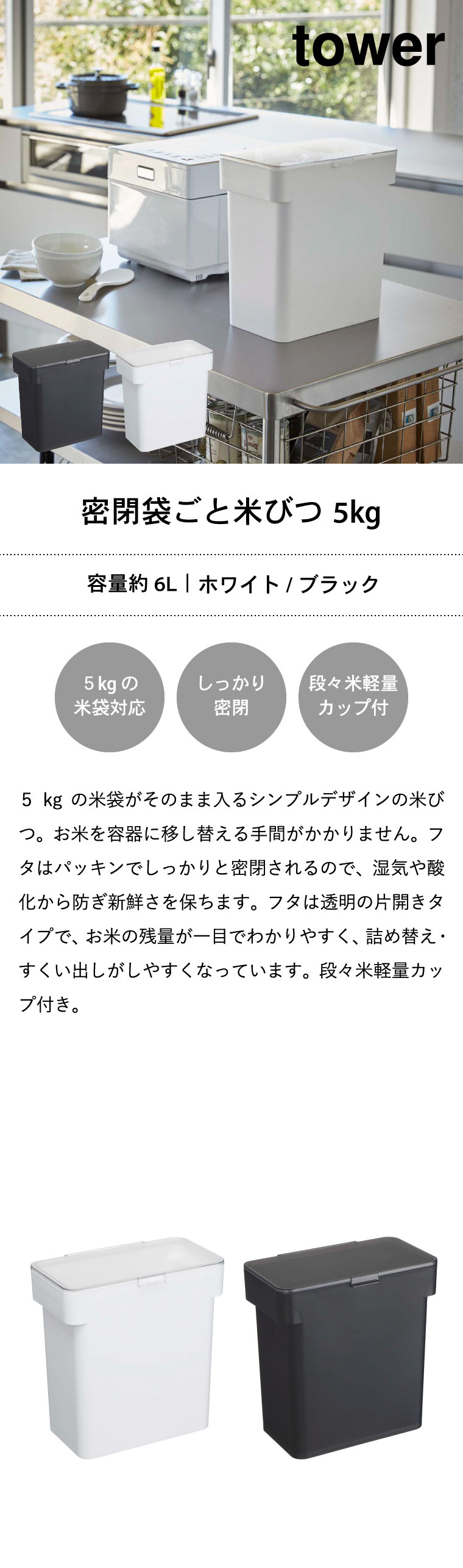 密閉 袋ごと米びつ タワー 5kg 計量カップ付 WH