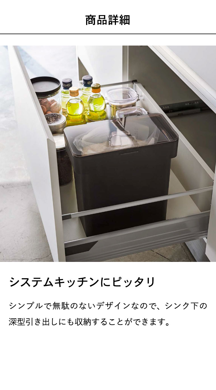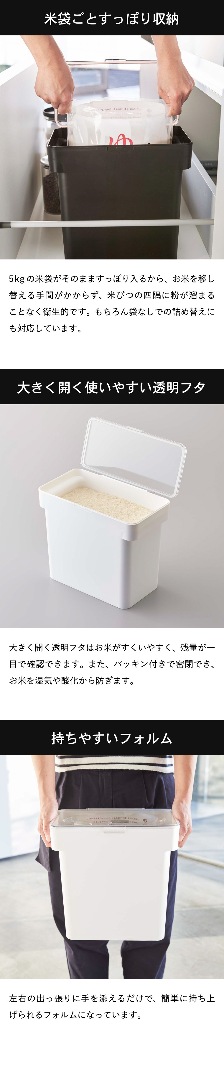 ●対応サイズ:本体:6?(お米:約5kg) 計量カップ180ml ●素材・材質:本体:ポリプロピレン 蓋:ABS樹脂 パッキン:シリコーン ●商品サイズ:(約)横28×奥行き16.5×高さ28.5cm ●商品重量:(約)880g ●型番:KT-TW EG WH/KT-TW EG BK ●JANコード:4903208033756 4903208033763