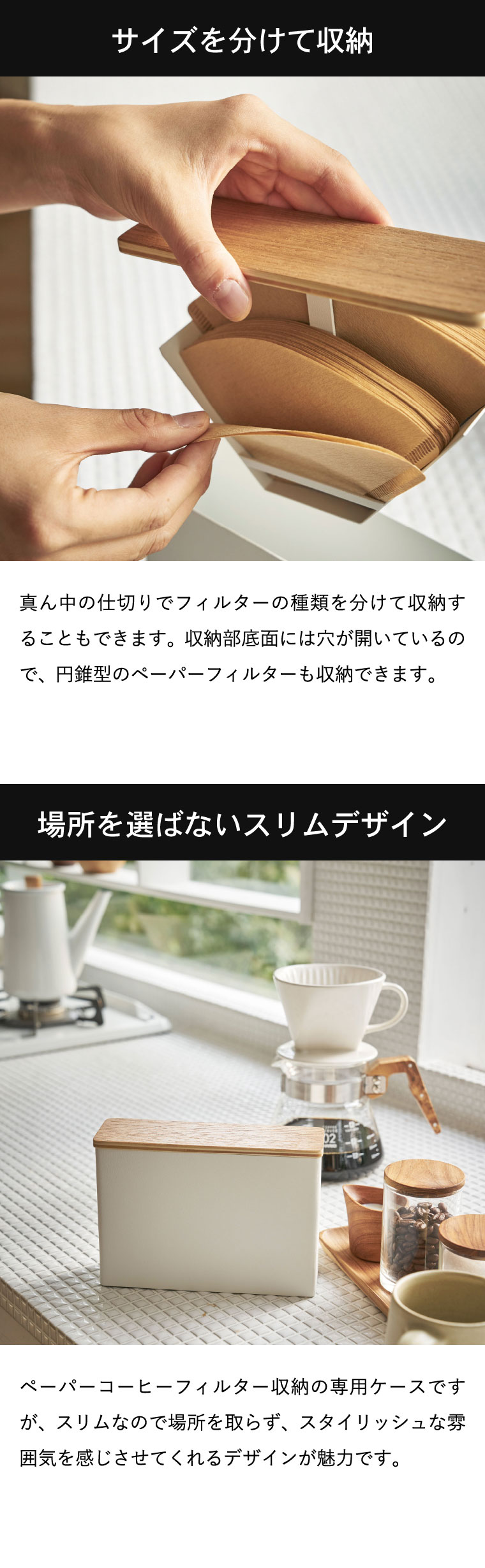 ●対応サイズ:扇形:1~2・2~4杯用ペーパーフィルター約100枚(片方約50枚) 円すい形:1~2・1~4杯用ペーパーフィルター約60枚(片方約30枚)