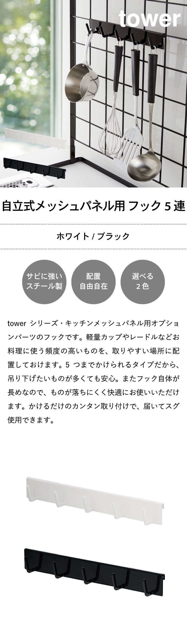 自立式メッシュパネル用 フック5連 タワー 山崎実業 tower ホワイト/ブラック 4183 4184 タワーシリーズ