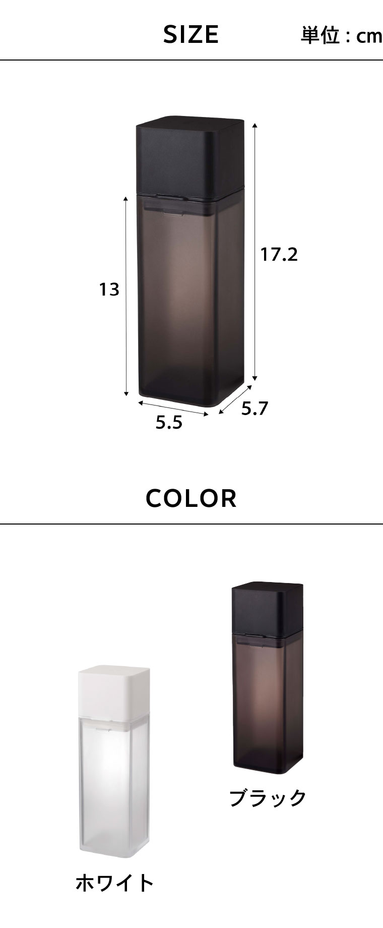 ●素材・材質:容器:AS樹脂 蓋・ノズル:ポリプロピレン パッキン:シリコーン ●商品サイズ:(約)横5.5×奥行き5.7×高さ17.2cm ●商品重量:(約)140g ●JANコード:4903208048422 4903208048439