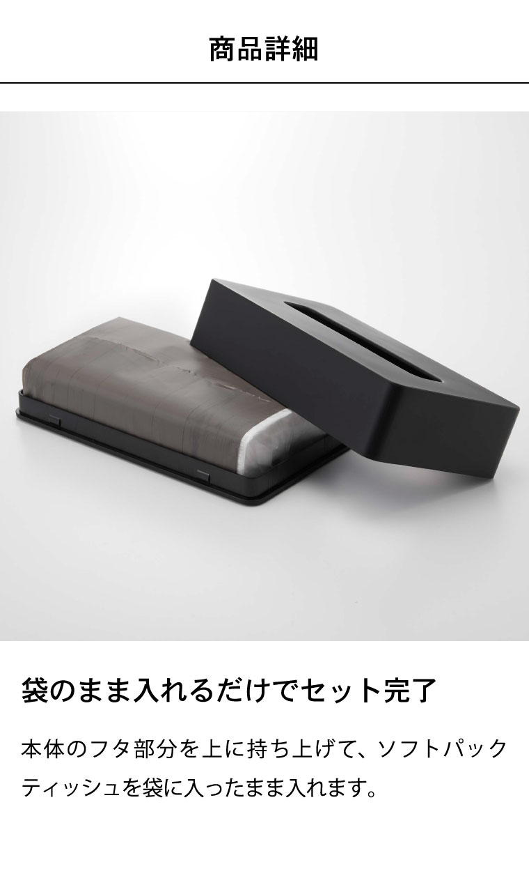 ※内寸以下のティッシュに対応、内寸より厚みのあるティッシュの場合は、収まりきらない場合や使い始めの数枚は取り出しにくい場合がございます。 ※箱ティッシュは対応していません。