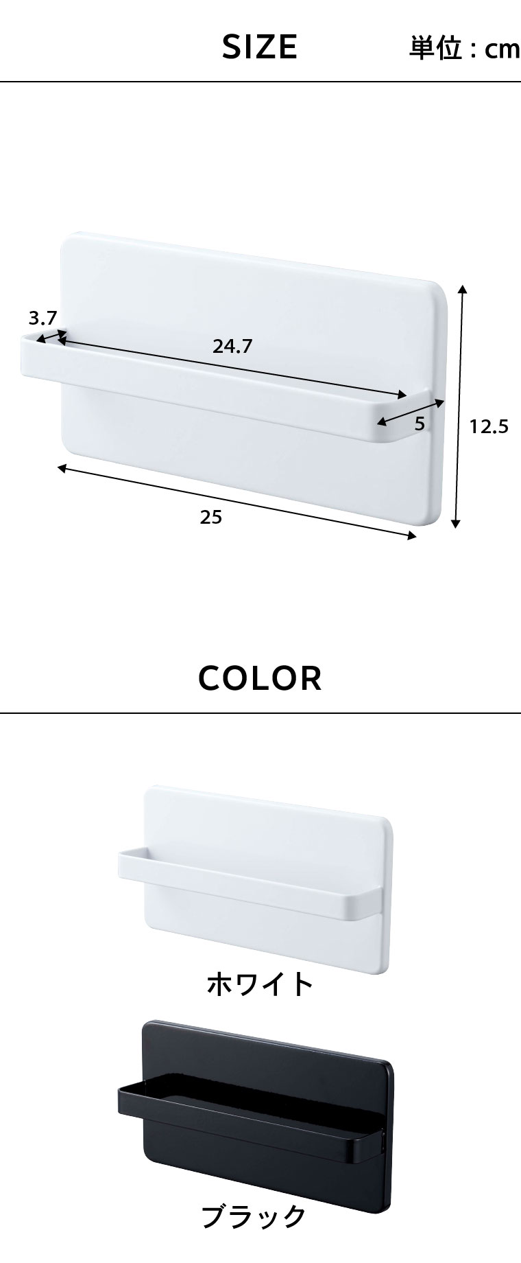 ●商品サイズ:約25X5X12.5cm ●商品重量:約420g ●内寸サイズ:ホルダー部:約W24×D3.7cm ●素材・材質:本体:スチール(粉体塗装) クッション:シリコーン ●付属品:吸盤(PVC)×4 木ネジ×2 ●耐荷重:約1kg ●JANコード:4903208049634 4903208049641