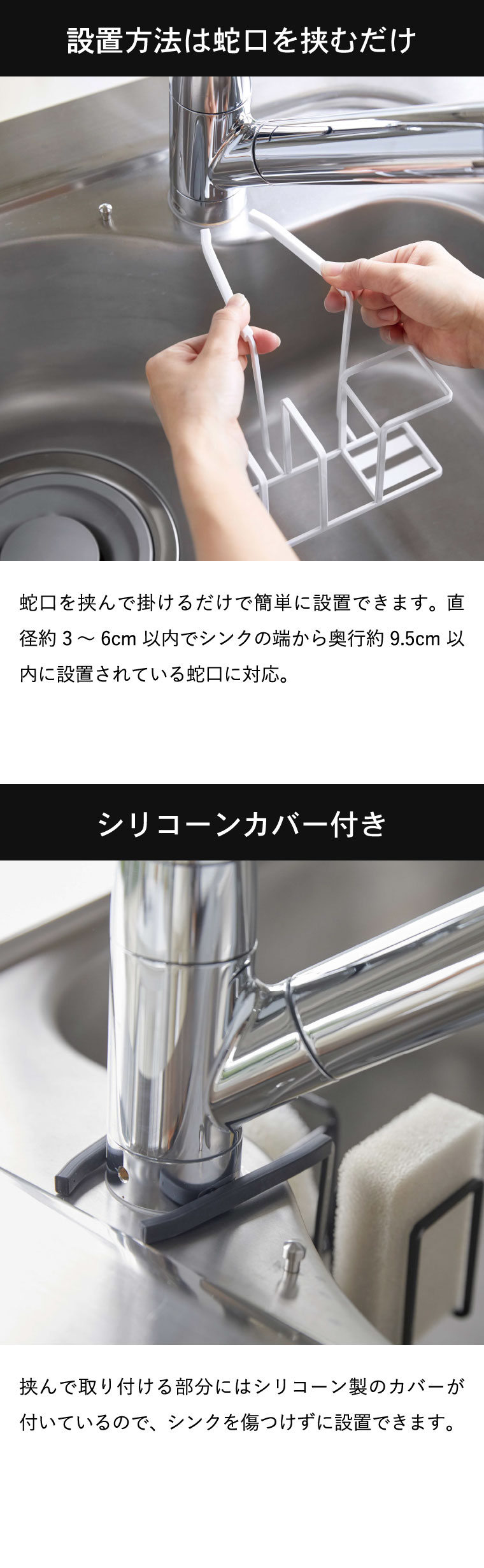 ●対応サイズ:蛇口:直径約3~6cm以内、シンクの端から奥行約9.5cm以内に設置されているもの シンク:深さ約13cm以上 スポンジ:厚さ約3.5cm以内