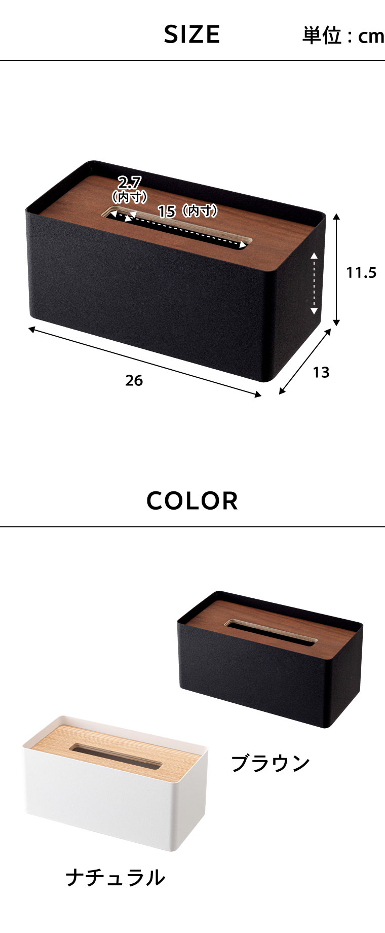 ●商品サイズ:約26X13X11.5cm ●商品重量:約1100g ●素材・材質:本体:スチール(粉体塗装) 蓋:天然木積層合板(ラッカー塗装) ●対応サイズ:一般的なサイズのティッシュ・ペーパータオル・高さ約10cmまでの厚型ティッシュボックス ●JANコード:4903208051774 4903208051781