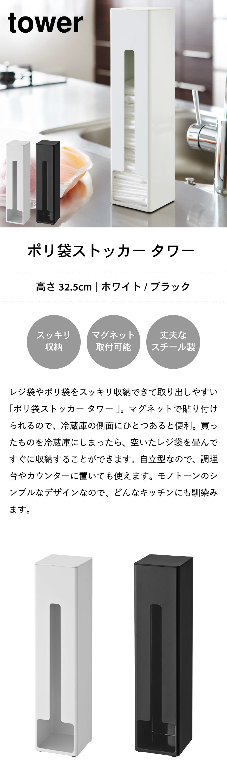 ポリ袋ストッカー タワー 山崎実業 tower ホワイト/ブラック 7839 7840 タワーシリーズ