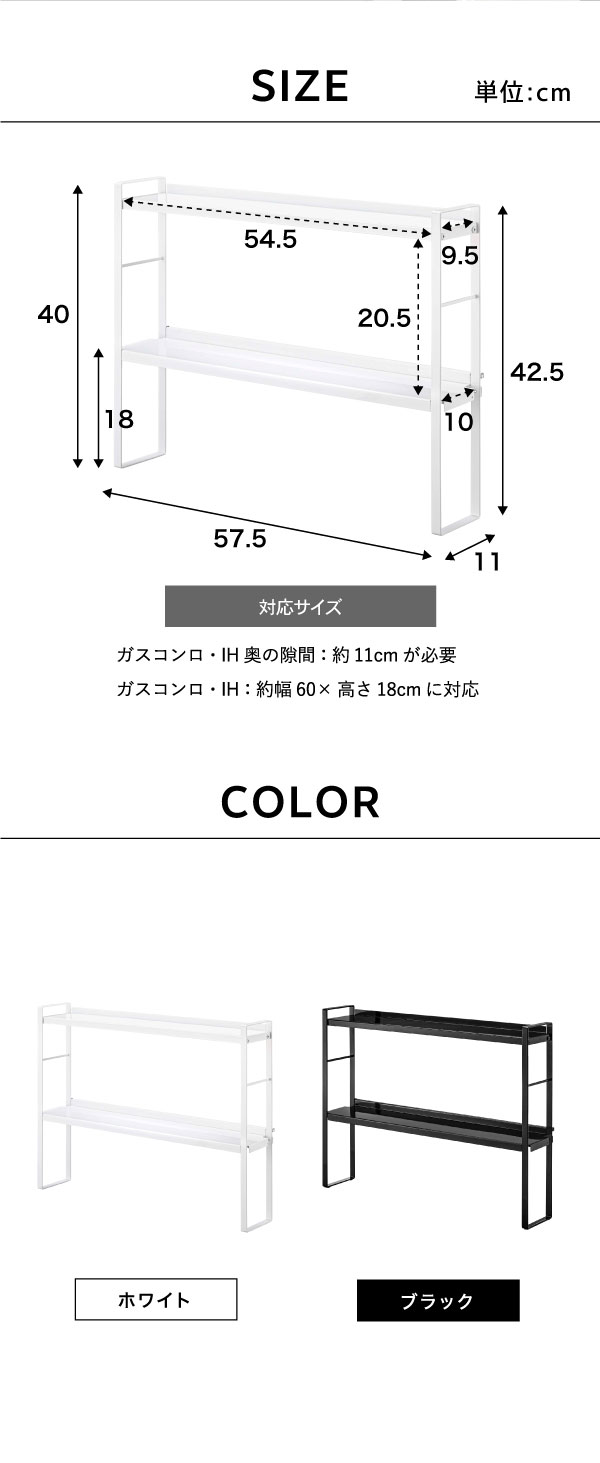 ●対応サイズ:ガスコンロ・IHクッキングヒーター奥の隙間:約11cmが必要。 ガスコンロ・IHクッキングヒーター:約W60×H18cmに対応。