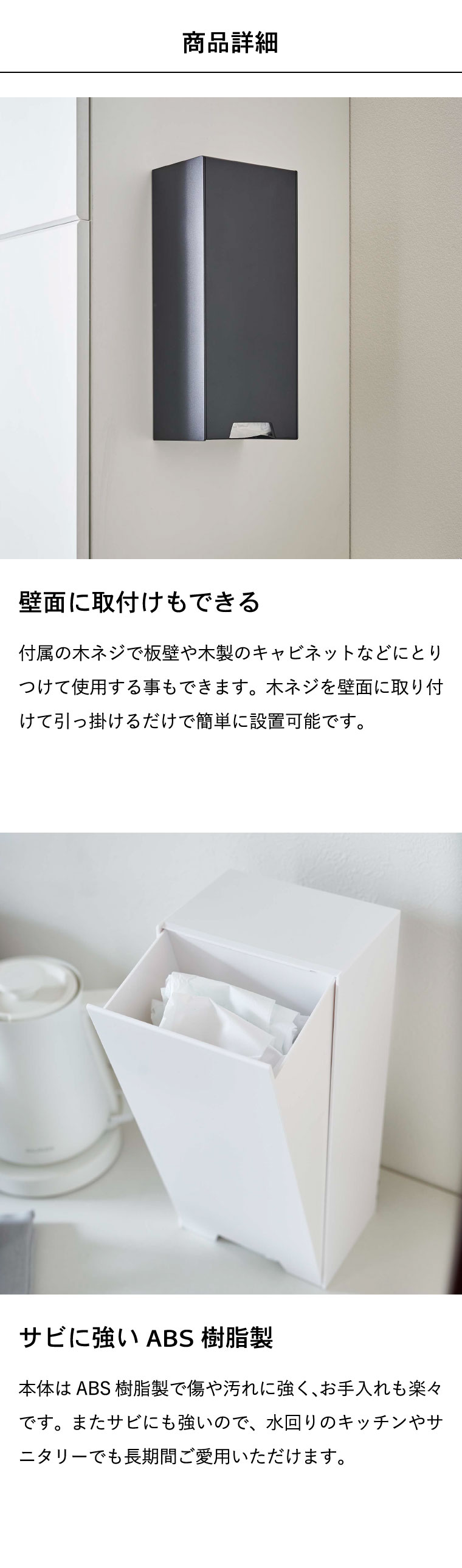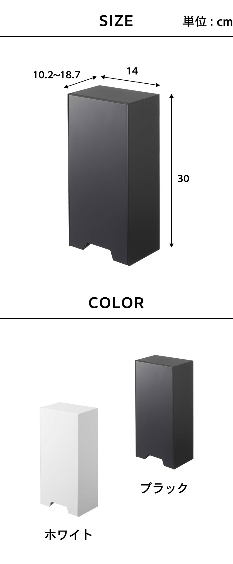●商品サイズ:約14X10.2~18.7X30cm ●内寸サイズ: 約W12.5×D8.5×H26cm ●素材・材質: 本体 : ABS樹脂 マグネット 滑り止め:シリコーン ●付属品:木ネジ×2 ●耐荷重:約2kg ●JANコード:4903208054379 4903208054386