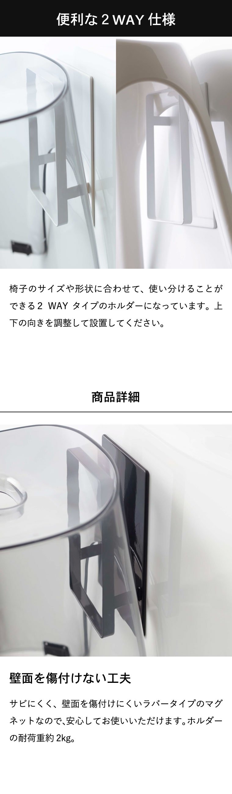 ●商品サイズ:約12X5X20cm ●商品重量:約560g ●素材・材質: 本体:スチール(ユニクロメッキ+粉体塗装) マグネット 滑り止め:シリコーン ●耐荷重:約2kg ●JANコード:4903208053952 4903208053969