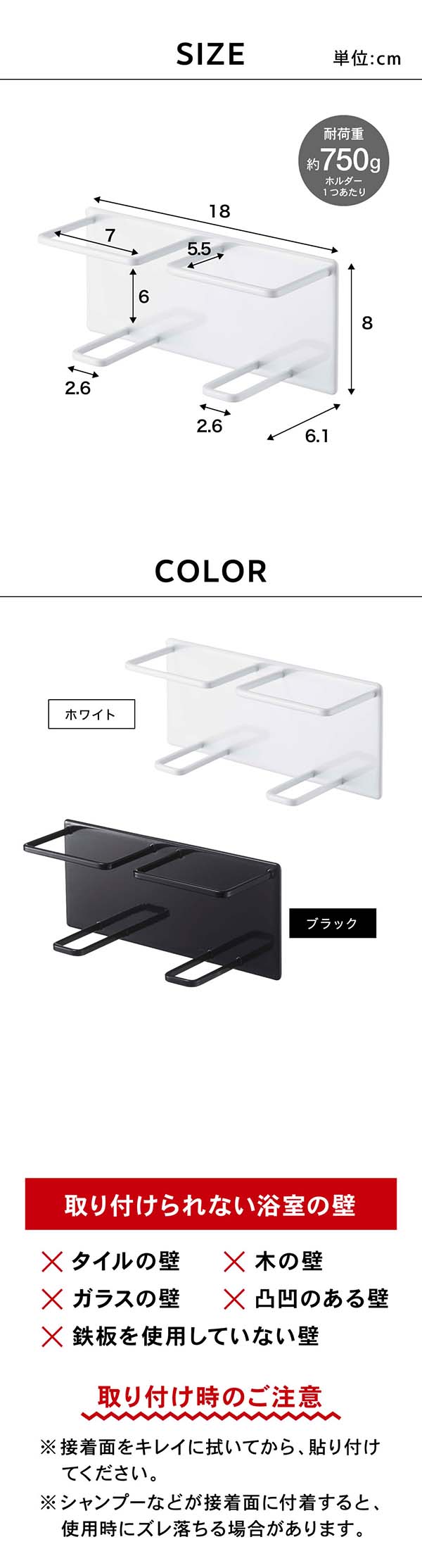 ●耐荷重:ホルダー1つあたり:約750g