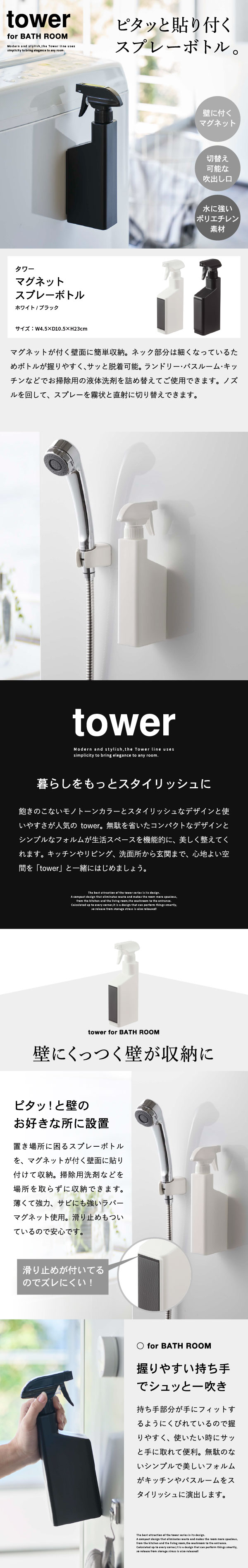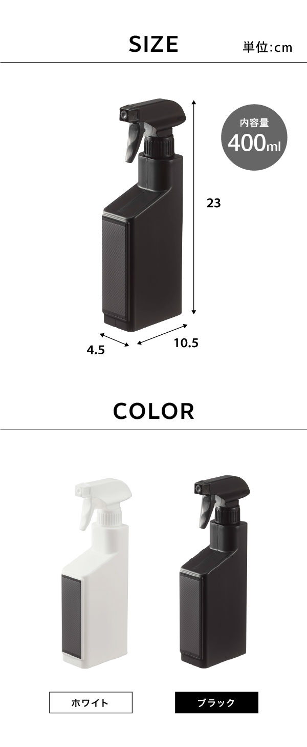 ●商品サイズ:約4.5X10.5X23cm ●商品重量:約105g ●素材・材質: 本体:ポリエチレン マグネット 滑り止め:シリコーン スプレー:ポリプロピレン パイプ:ポリエチレン ●耐荷重:約500g ●耐熱:100℃ ●耐冷:-40℃ ●内容量:約400mL ●JANコード:4903208053808 4903208053815