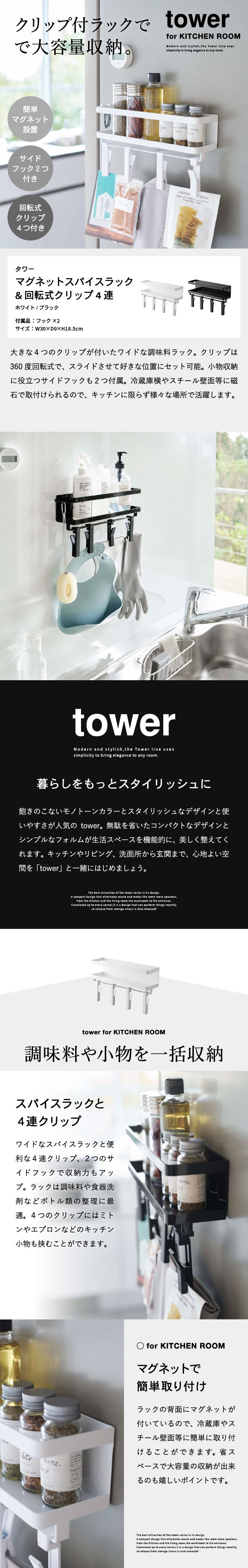 ≫/ 【3】TOWER マグネットスパイスラック&回転式クリップ 4連