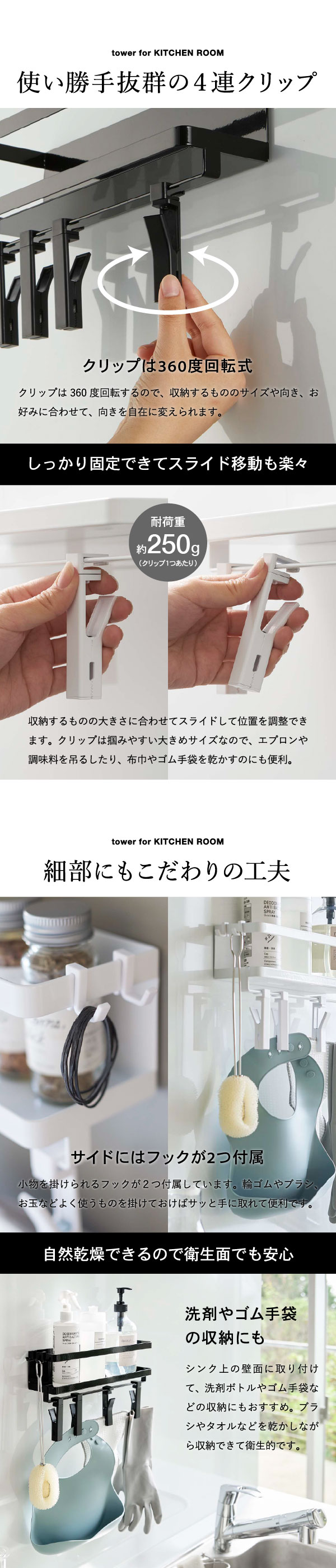 ●耐荷重:収納部:約2kg クリップ:約250g(1つあたり) フック1つあたり:約250g
