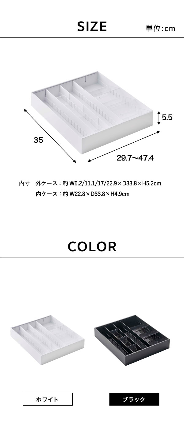 ●内寸サイズ: 外ケース:約W5.1・11・16.9・22.8×D33.8×H5.2cm 内ケース:約W22.8×D33.8×H4.9cm 1ピッチ:約W5.1cm 2ピッチ:約W11cm 3ピッチ:約W16.9cm 4ピッチ:約W22.8cm