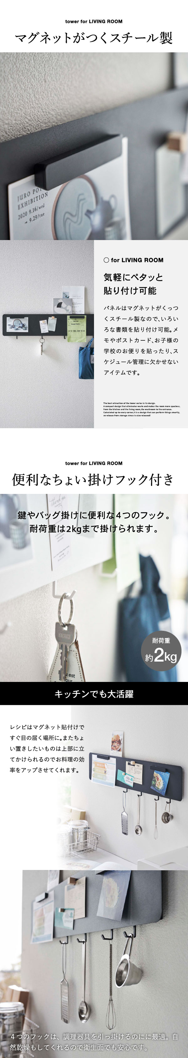 フック付きウォールスチールパネル タワー ワイド 山崎実業 tower ホワイト/ブラック 5530 5531 タワーシリーズ