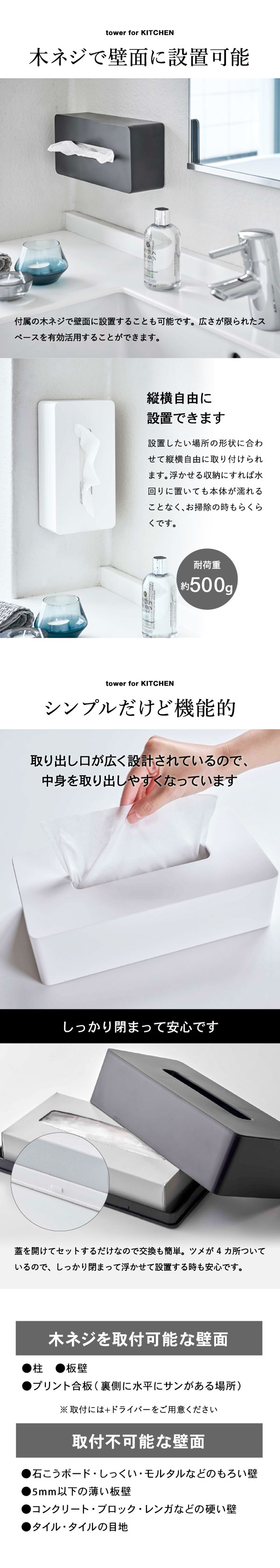 ●対応サイズ:高さ約7cmまでの一般的なティッシュボックス ※枚数の目安:200組(400枚)以内