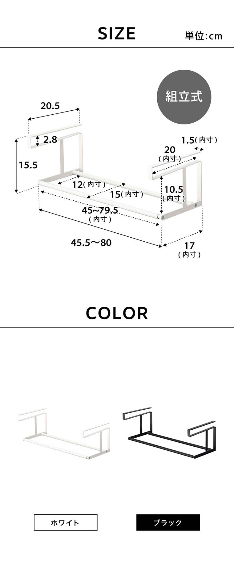 ●内寸サイズ: 収納部:約W45~79.5cm バーの距離:約12cm 高さ:約10.5cm