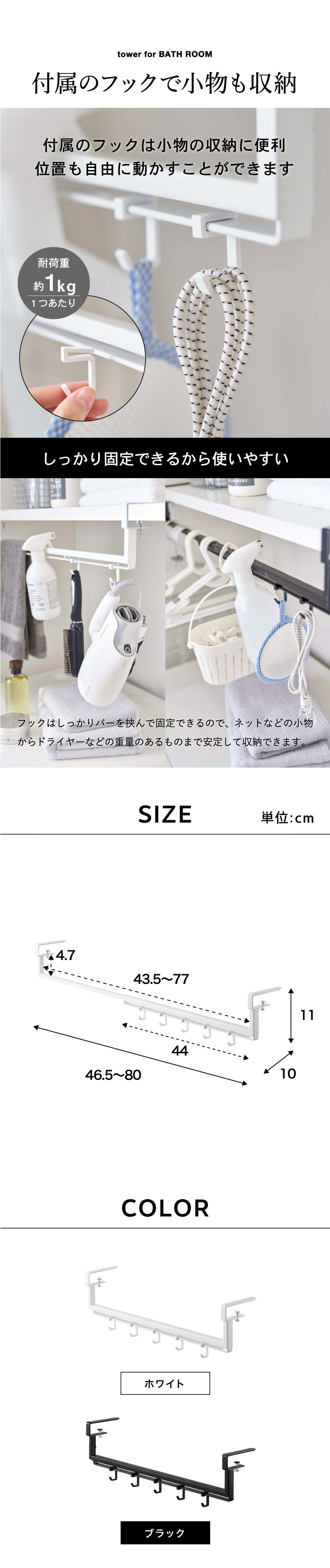 ●内寸サイズ: バー:約W43.5~77×H4.7cm フック取付部分:約W44cm