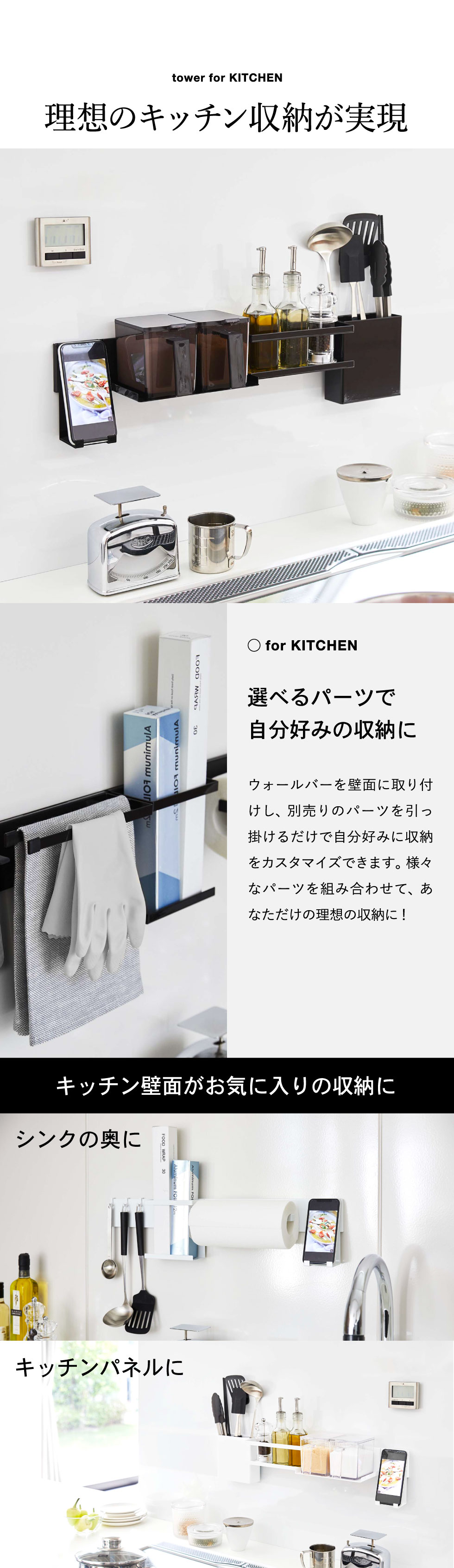 フィルムフック キッチンウォールバー タワー 山崎実業 tower ホワイト/ブラック 5674 5675 タワーシリーズ