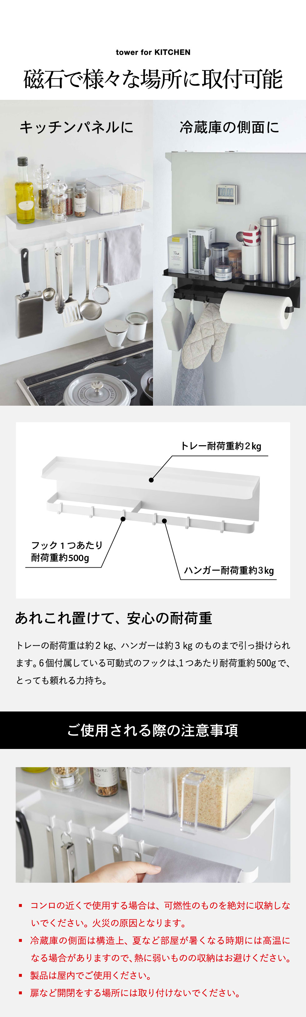 ●耐荷重:トレー部:約2kg バー部:約1kg フック:約500g(衝撃をゼロとした場合の静止耐荷重です。)