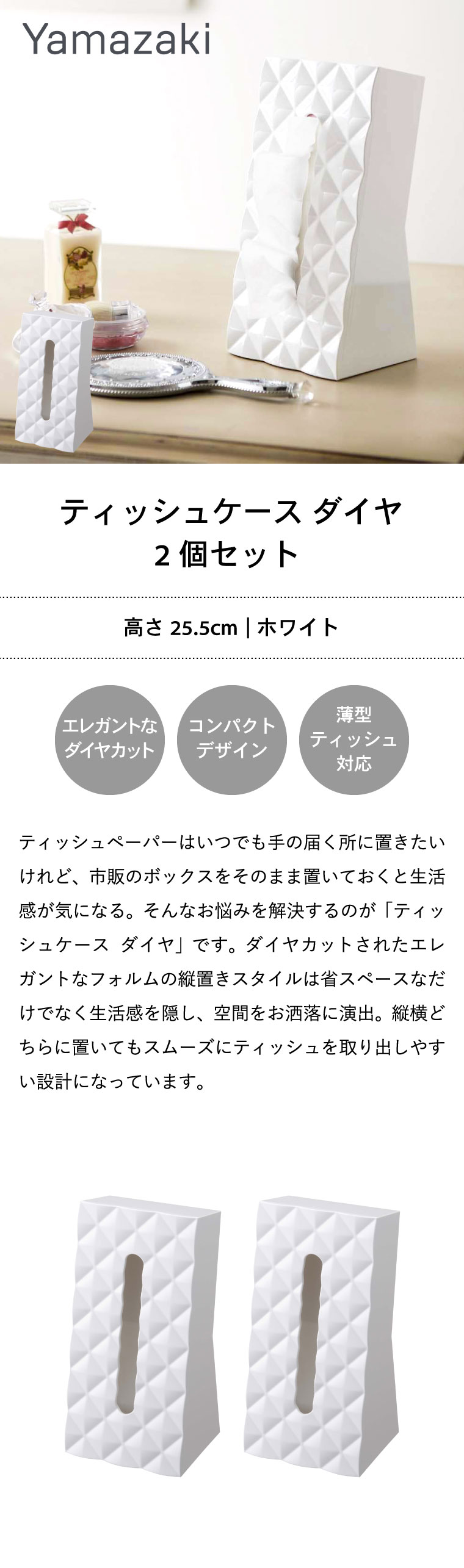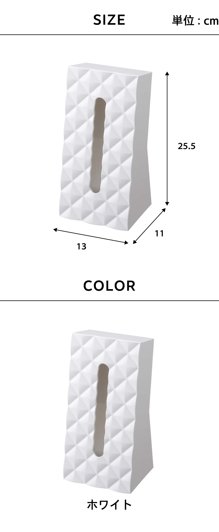 ●商品内容:2個 ●商品サイズ:(約)W13×D11×H25.5cm ●商品重量:約340g ●素材・材質: 本体:ABS樹脂 ●対応サイズ:高さ5.3cmまでの一般的な薄型サイズのティッシュボックス ●JANコード:4903208064149