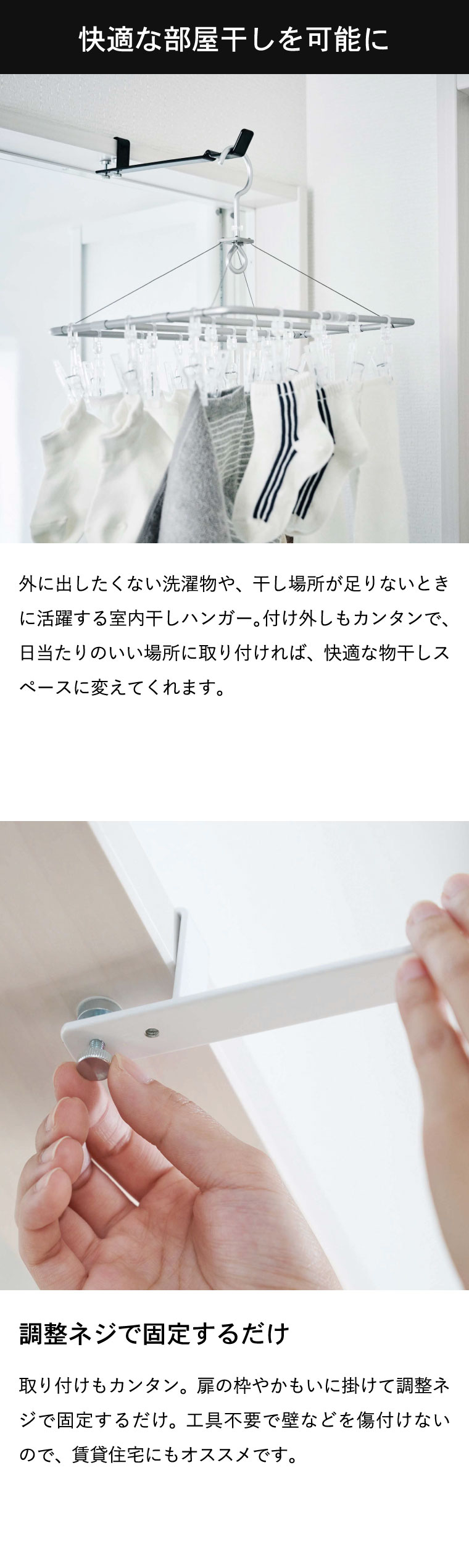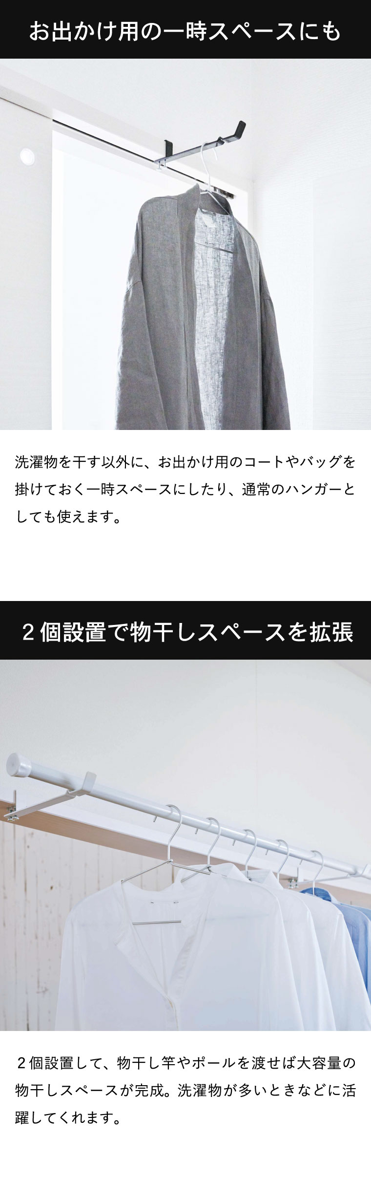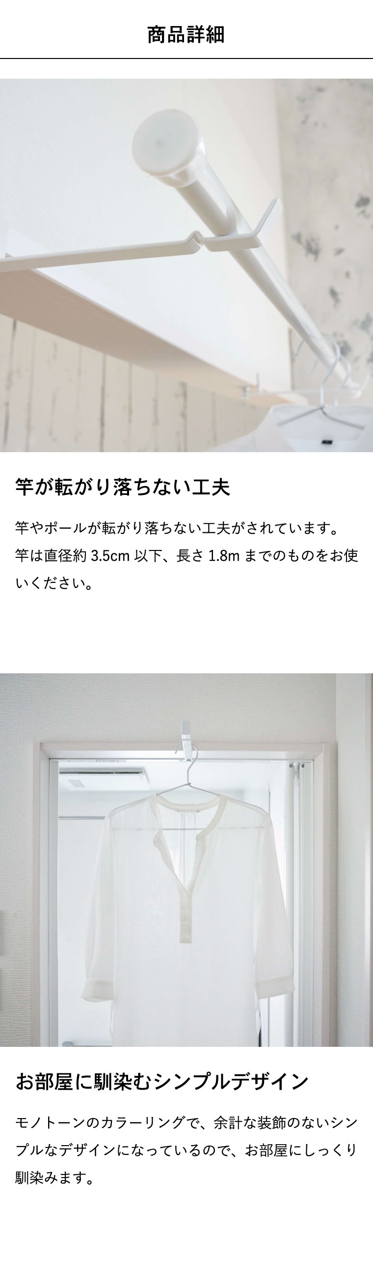 ●対応サイズ:枠・かもいの厚み:約15~30mm 枠・かもいの引っ掛け部分:約8mm以上 【製品2個使用時】室内物干し竿:直径約35mm以下 ※長さ約1.8mまでの間でご使用ください。